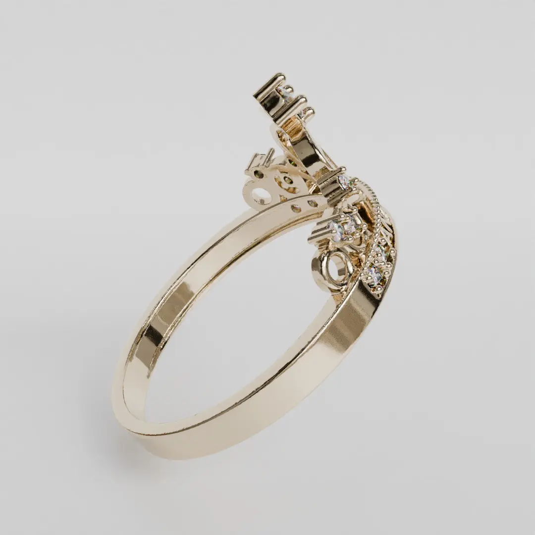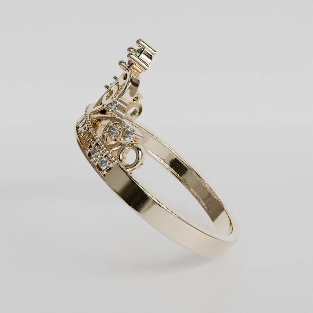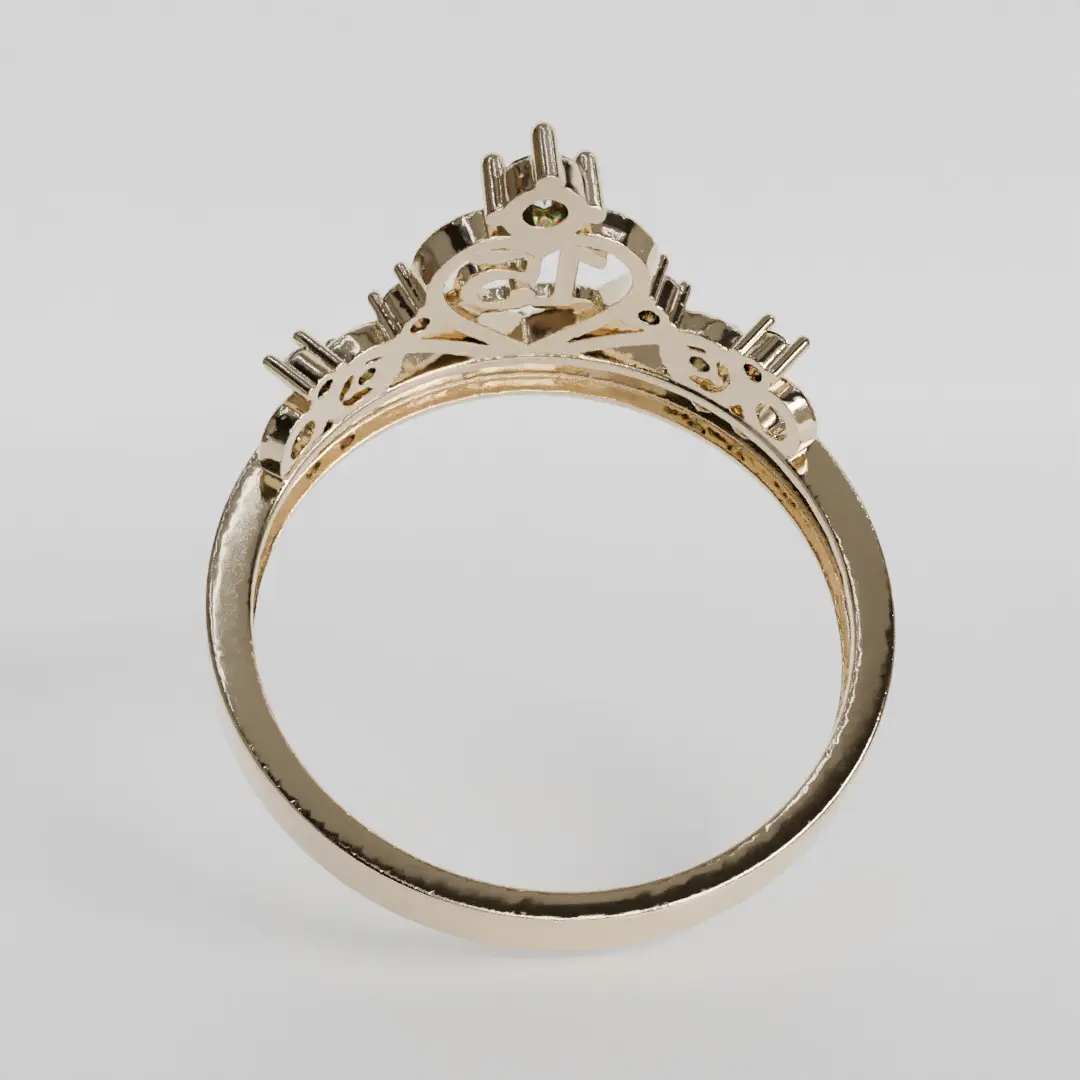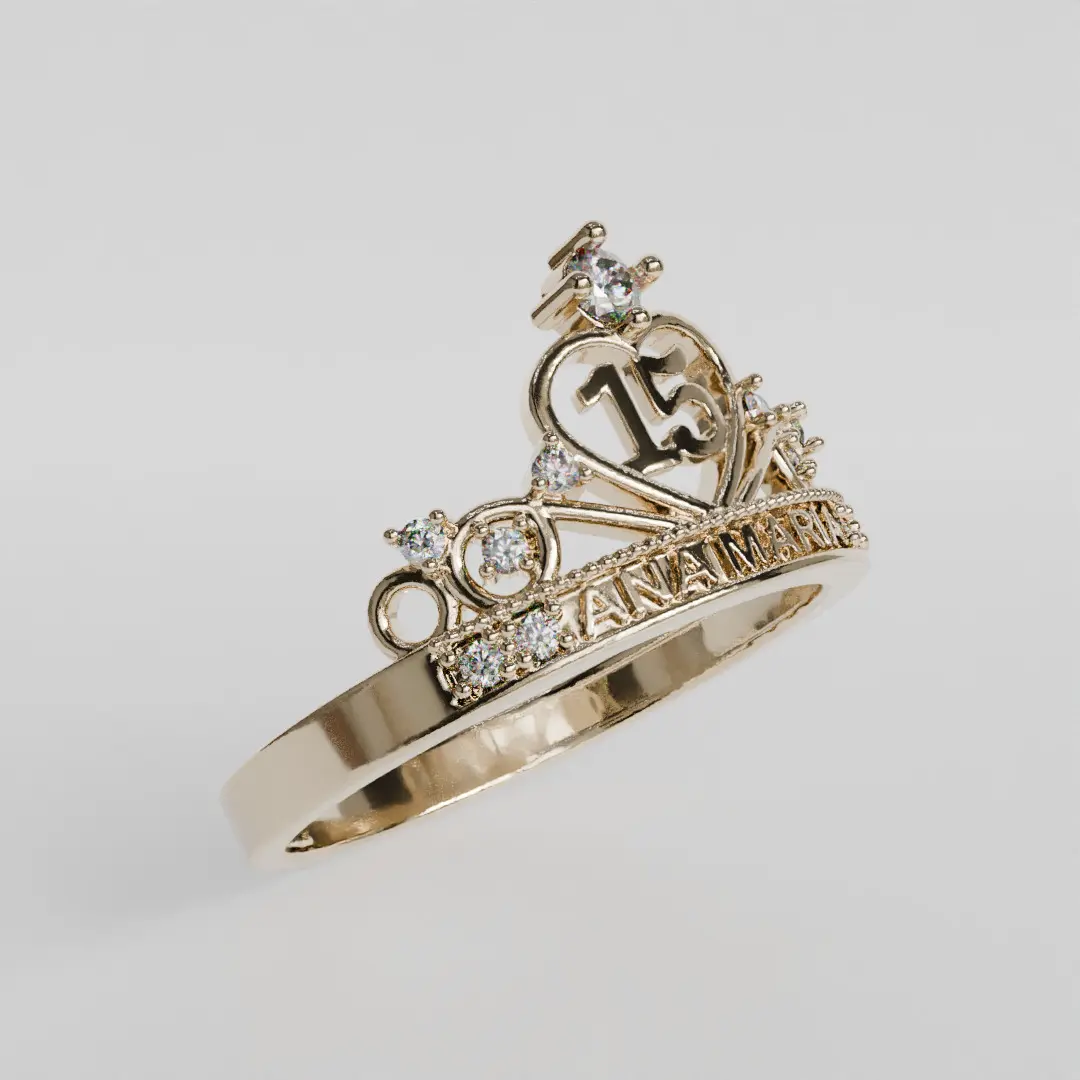 Crown ring with a heart and a crown-shaped number fifteen in the centerwith cubic zirconia or diamond inlays, one 2.5 mm diameter ring and ten 1.25 mm diameter rings