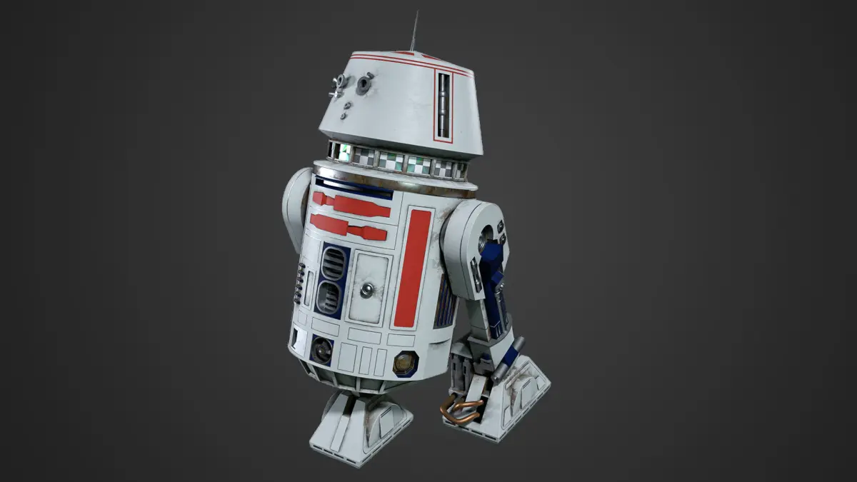 This 3d model is also known as R5-D4, also called Red by Luke Skywalker, was a red and white-striped R5 astromech droid owned by a group of Jawas on Tatooine in the early days of the Galactic Civil War.