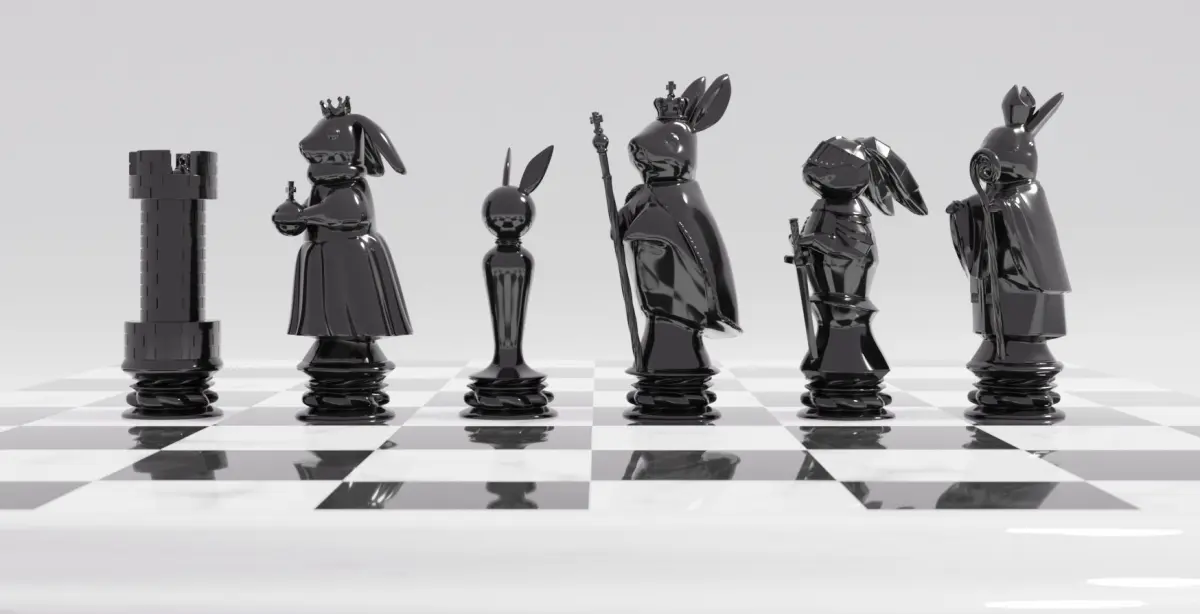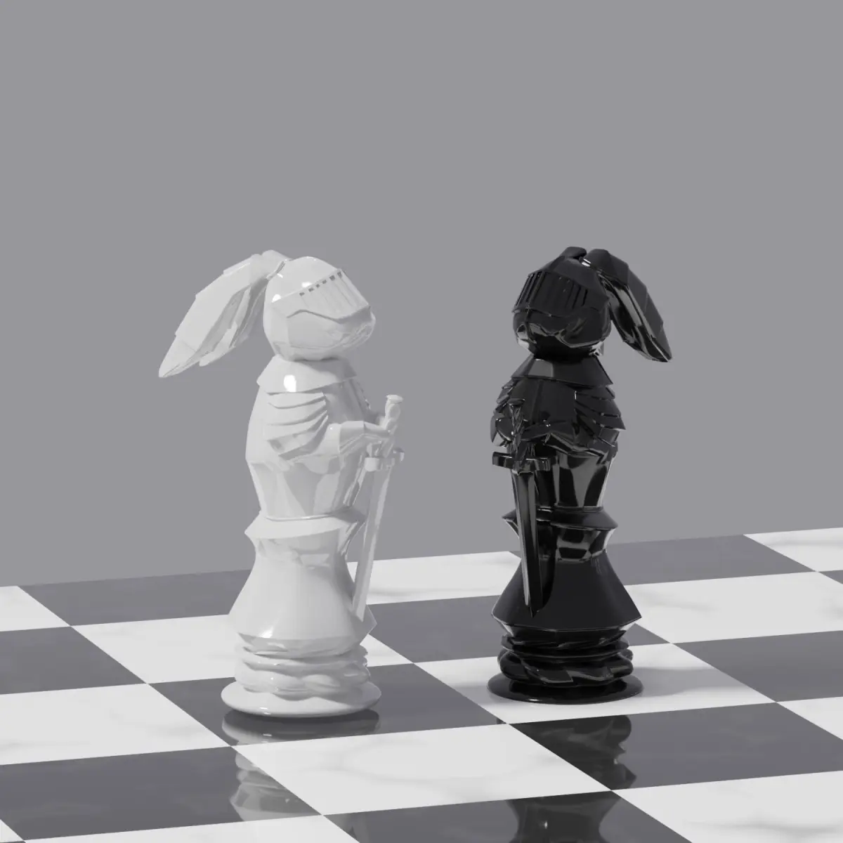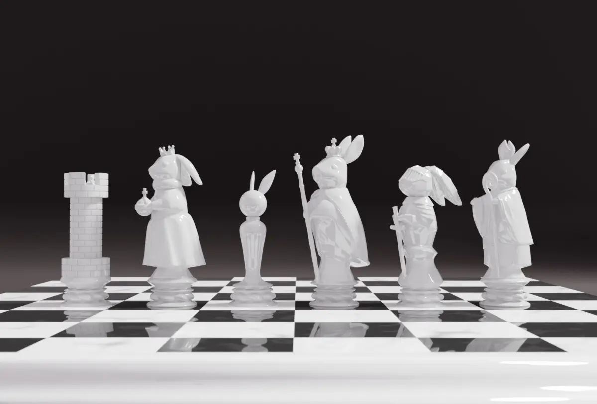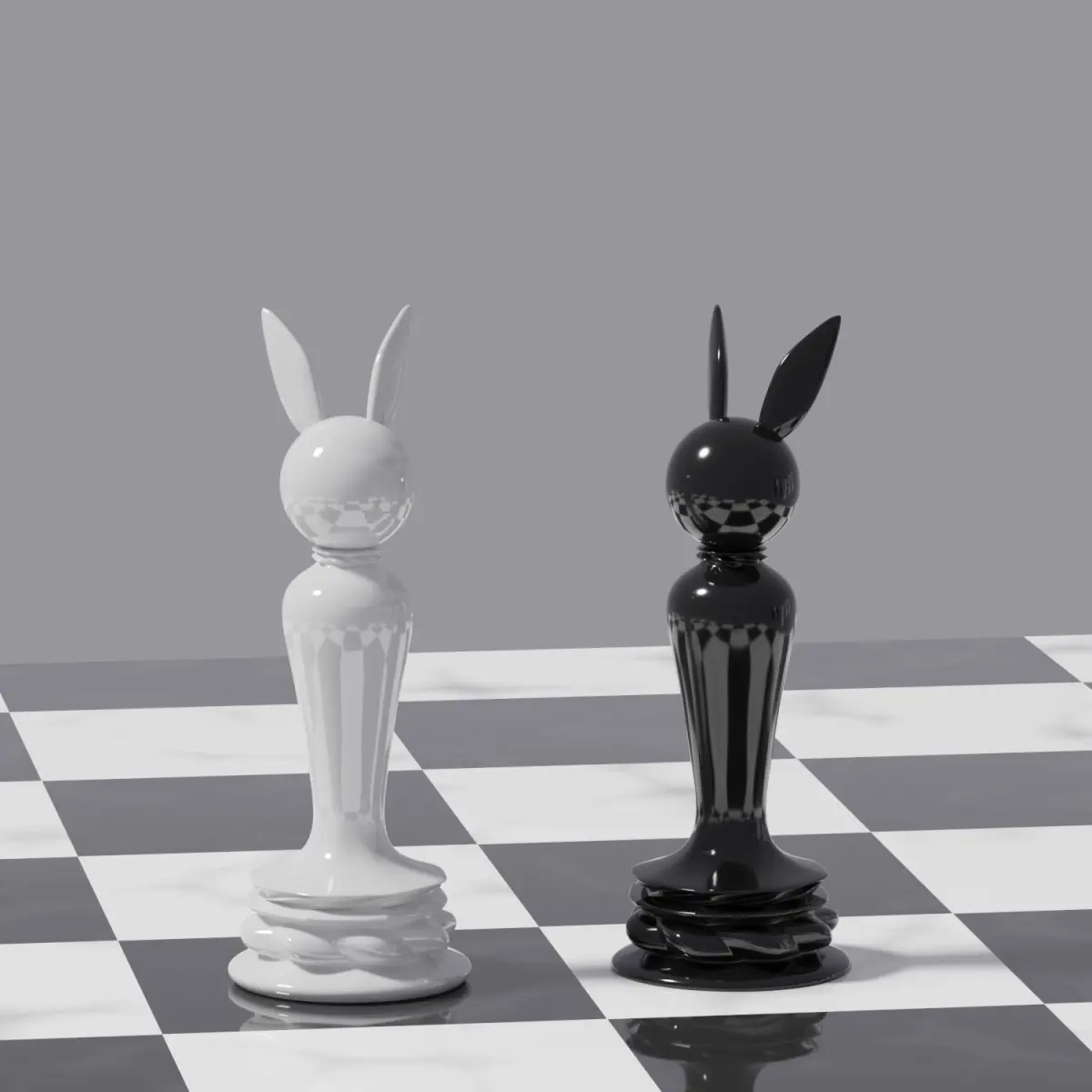 Chess with a rabbit motif.The contents are King, Queen, Bishop, Knight, Rook, and Pawn.Cute rabbit chess can be enjoyed not only as a game, but also as an interior decoration.