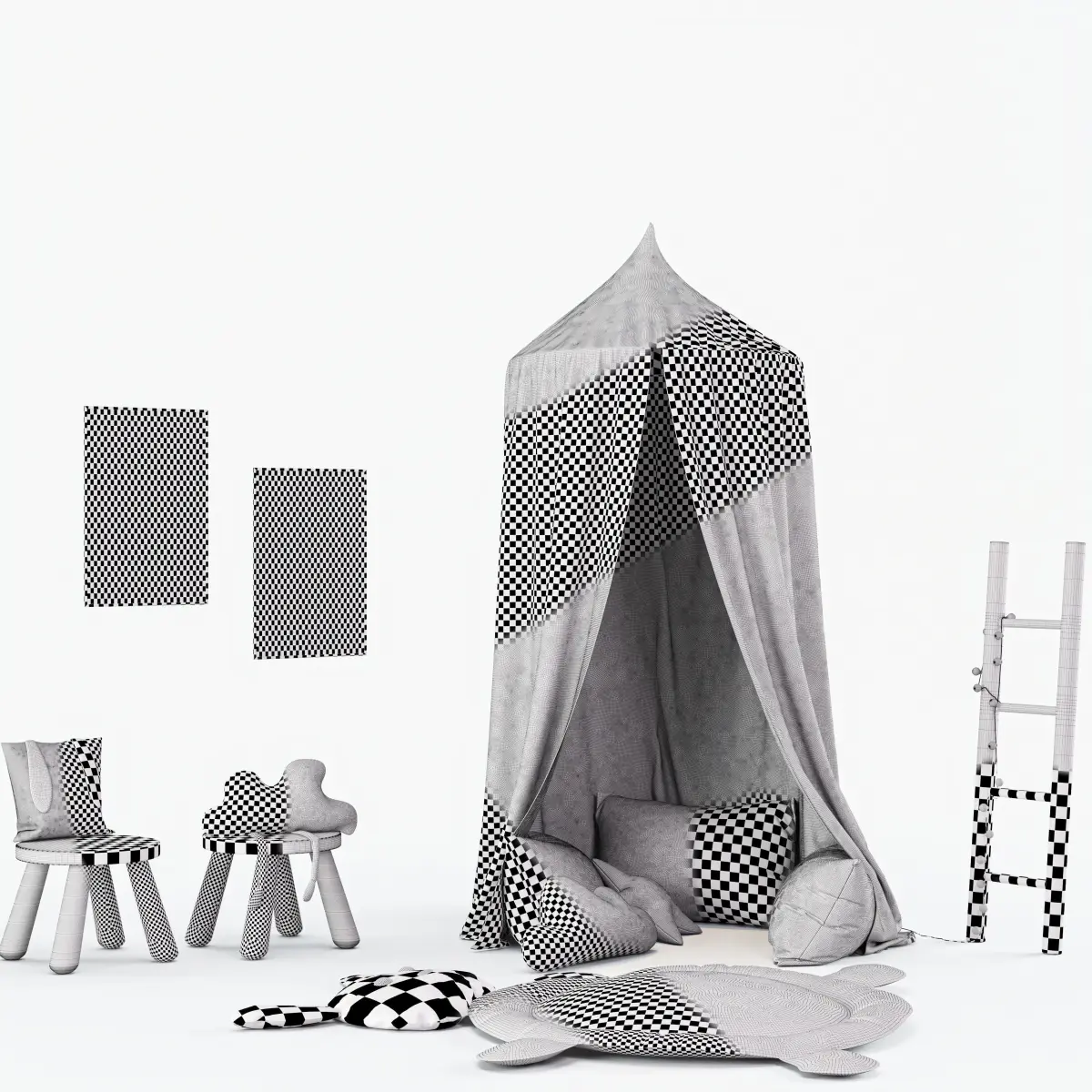 1Tent (1586 x 1524 x H 2591 mm)3 Regular pillow2 Smal chair (480x 480 x H 396 mm)1 Star pillow1 Cloud pillow1 Ladder (192 x 415 x H 1409mm)1 lighting rope1 Cloud doll pillow1 Rabbit doll pillow2 frame1 Rabbit rug (2033 x 2029 mm)