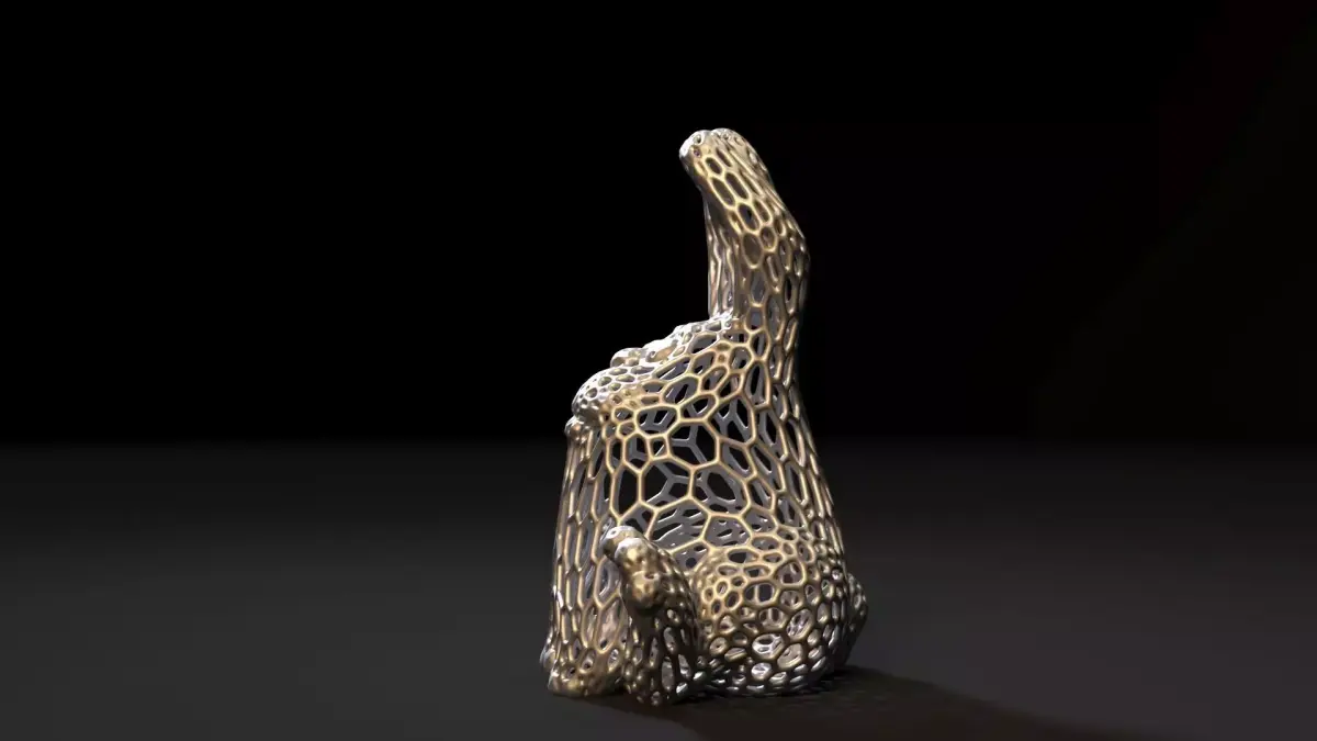 The surface of the figure is covered with the characteristic Voronoi-structure,consisting of intersecting curves and cells of varying sizes, which makesthe model visually interesting and adds a textural effect. These cells formrandom patterns that play with light and shadow.