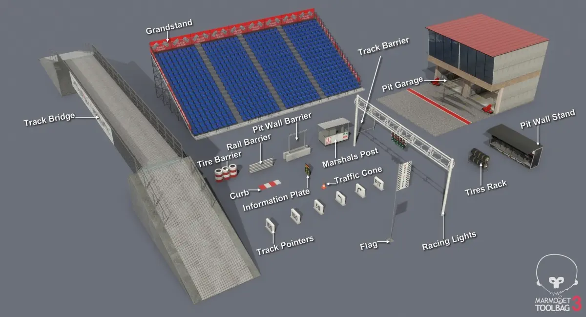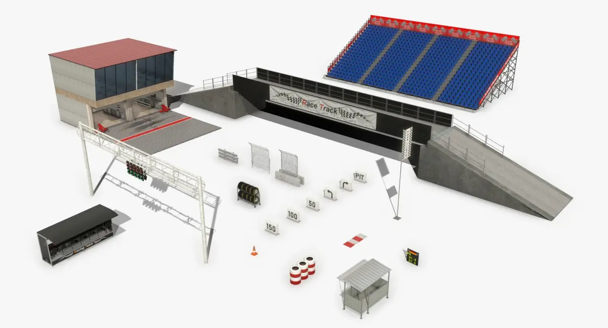 Low-poly game-ready Race Track Construction Kit 3D model collection. The collection is suitable for constructing a race track for Formula 1 or other circuit racing games/visualizations like Formula 2, WEC, Le Mans etc.