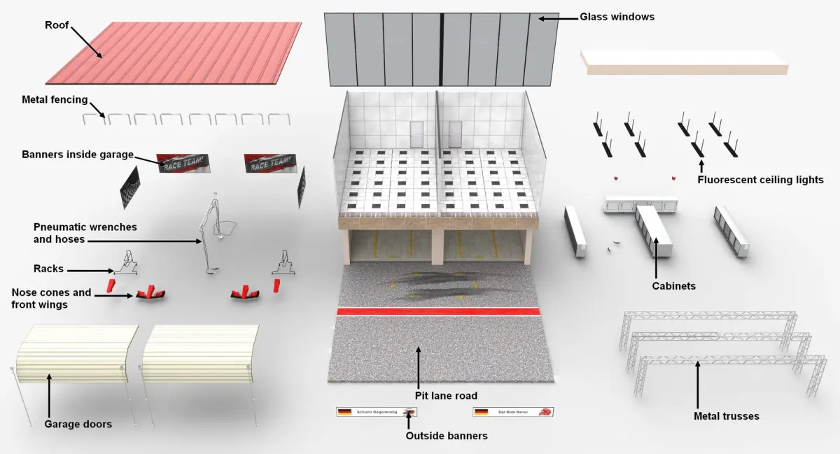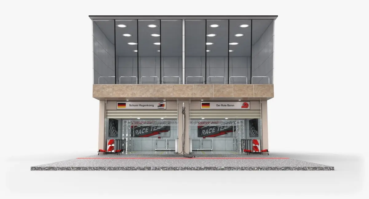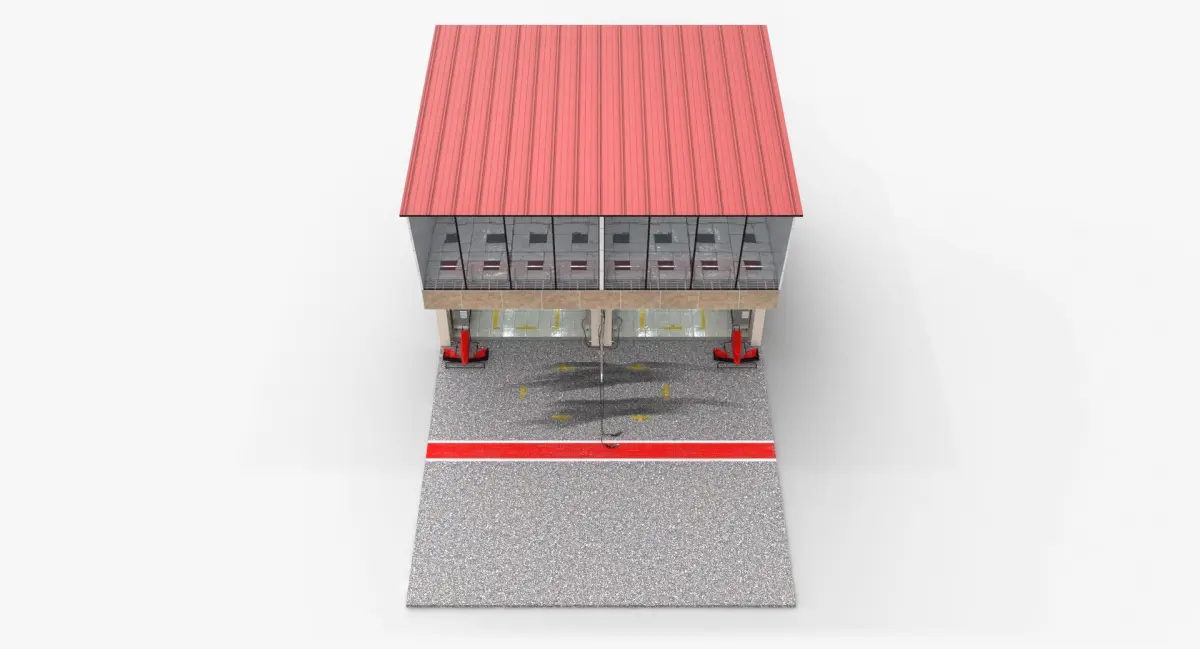 Low-poly game-ready 3D model of Race Track Pit Lane Garage / Pit Stop building, which is next to Pit Wall usually. It is suitable for creating a pit lane for Formula 1 or other circuit racing games/visualizations like Formula 2, WEC, Le Mans, etc.