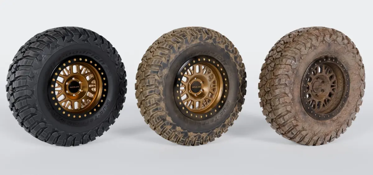 Rim and Tire are both included, with 4 material variations for the rim, and 3 variations for the tire.