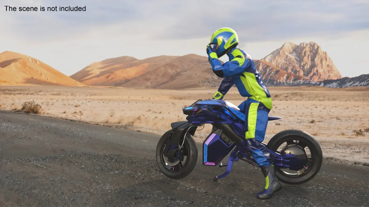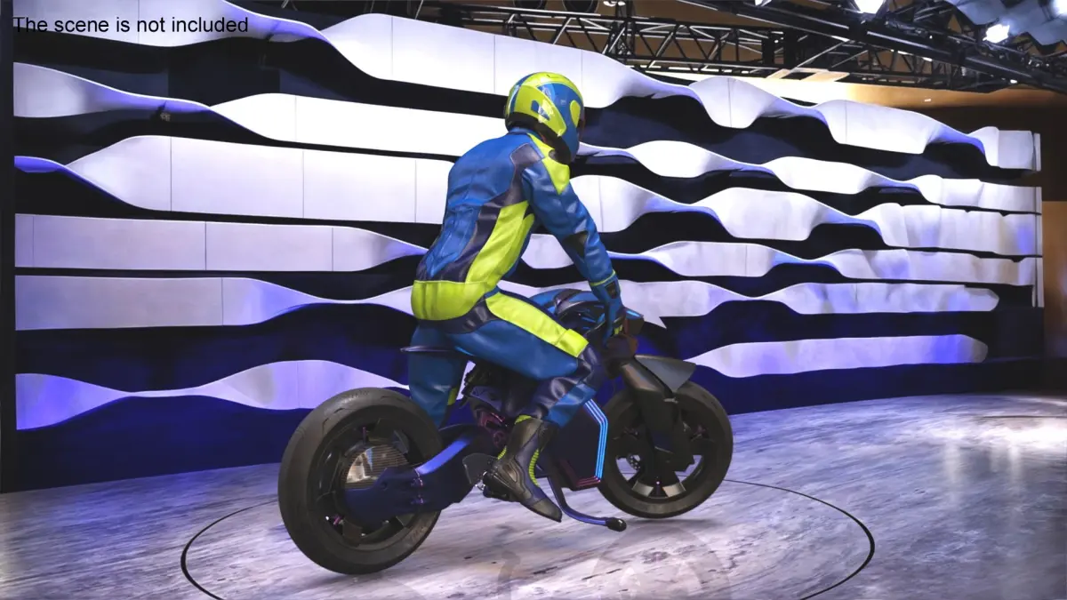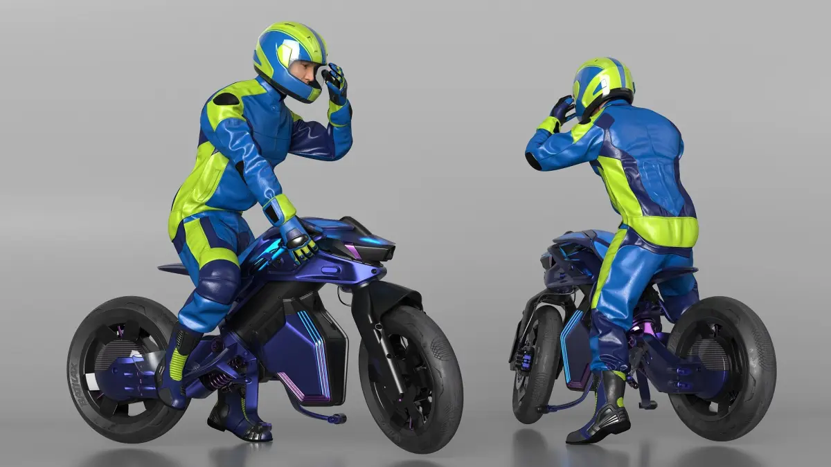 Racer on Futuristic Motorcycle is a model of male motorbike rider with an innovative two-wheeled vehicle designed to showcase advanced self-balancing technology and futuristic design aesthetics.