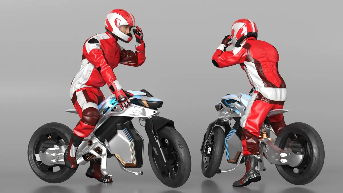 Racer on Yamaha MOTOROiD 2 is a three-dimensional model of male motorbike rider with advanced autonomous motorcycle prototype (biometric motorbike concept), showcasing Yamaha's futuristic design and AI-driven technology.