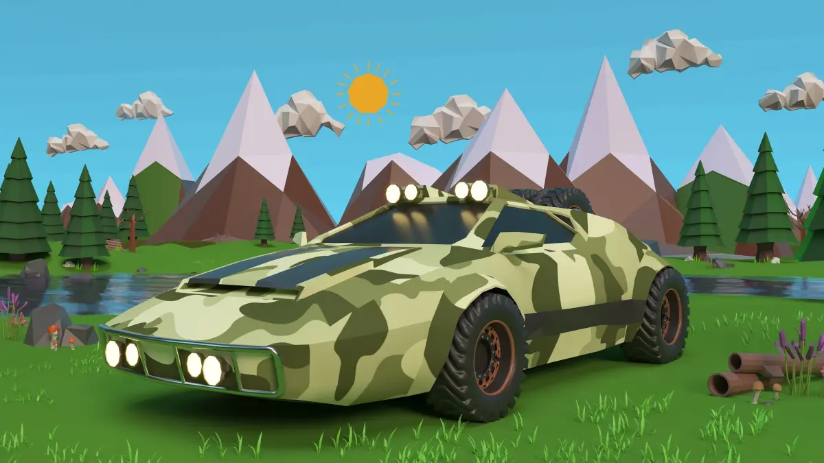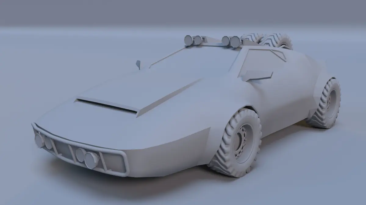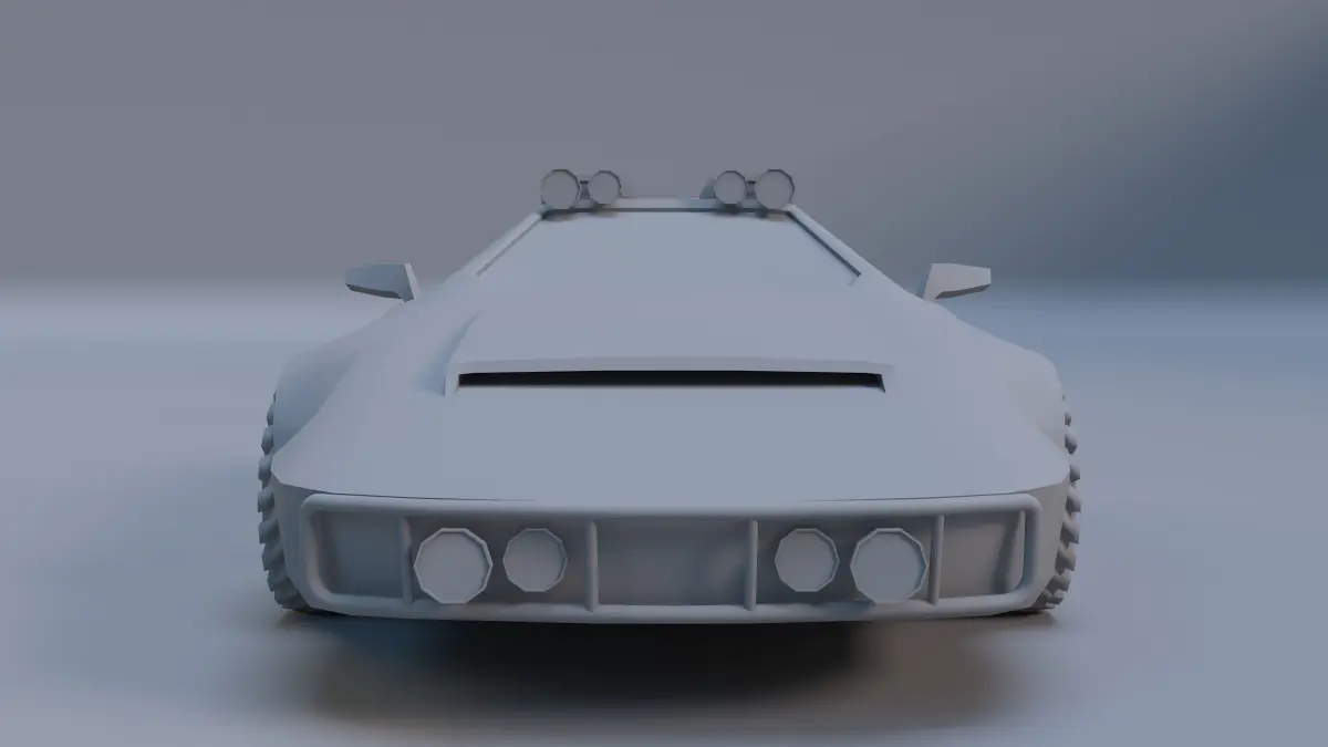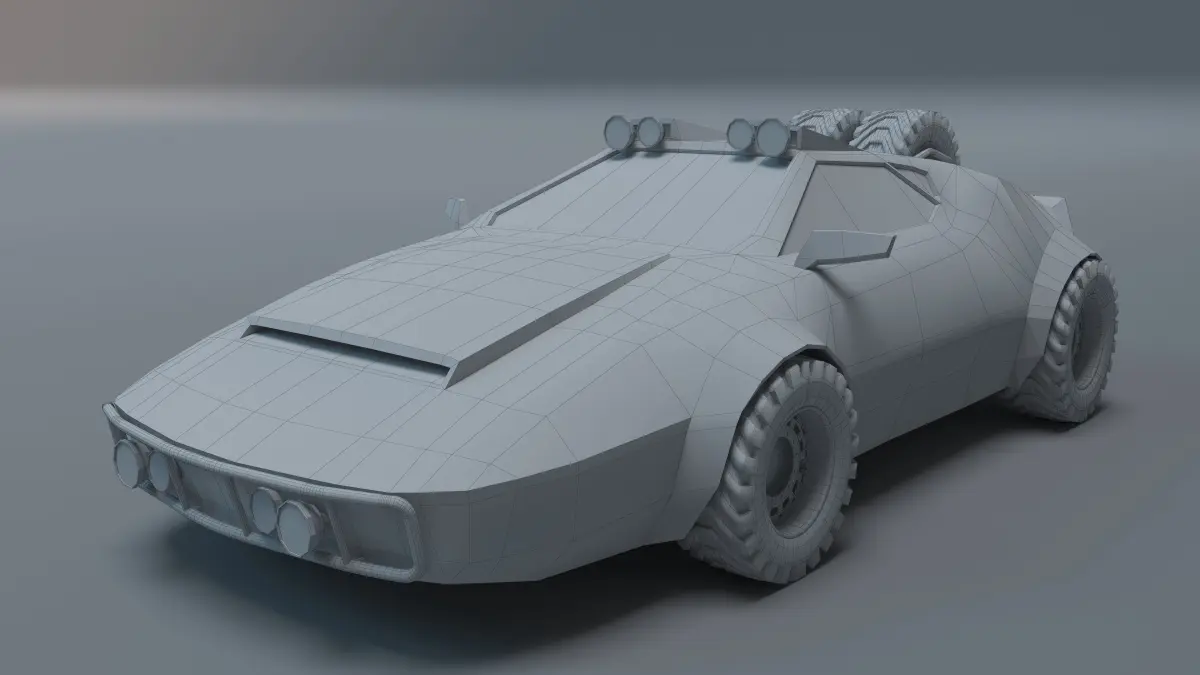 Low - poly model of a off road car.The off - road car model is inspired by a mix of the Lamborghini Countach and Lancia Stratos vehicle models which bring about a sports car appearance.