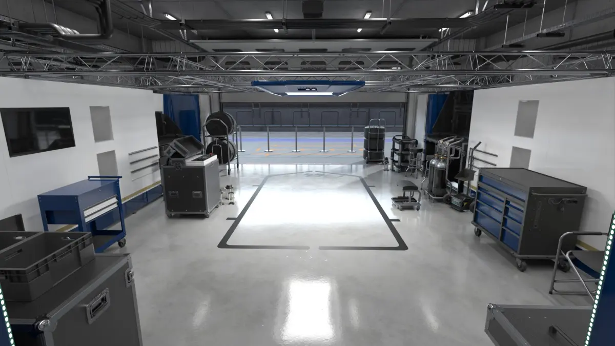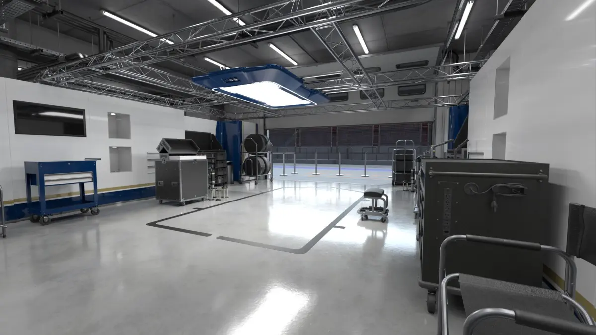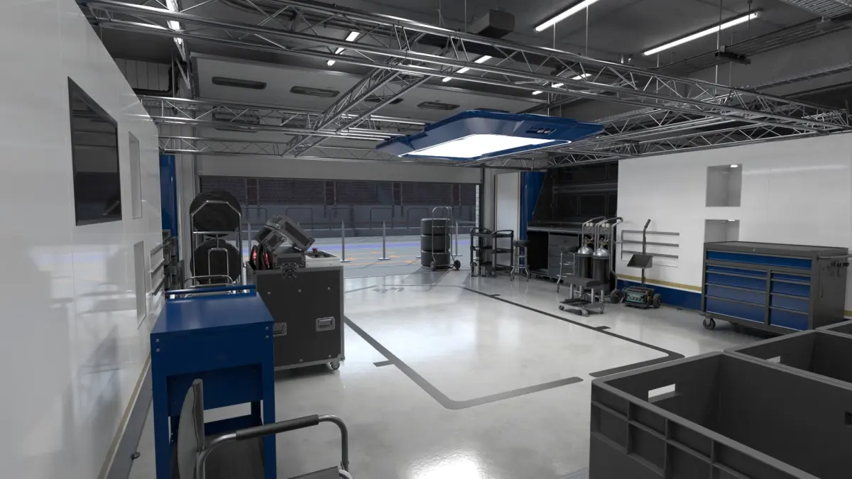 3D model of Racing Team Garage with Part Paddok and Racing Track for Car Racing Team.