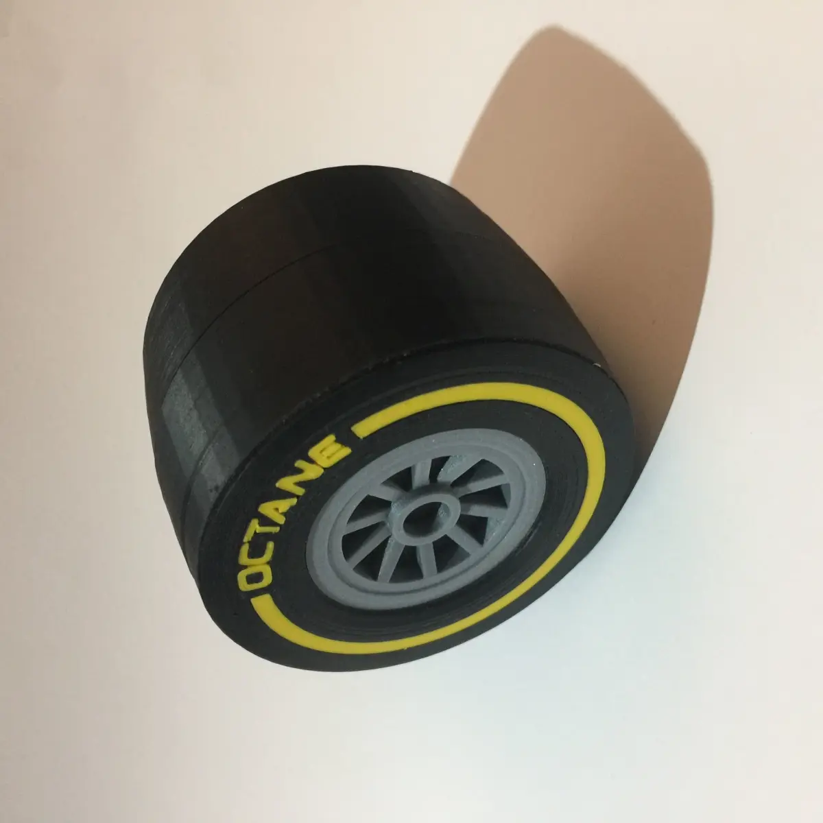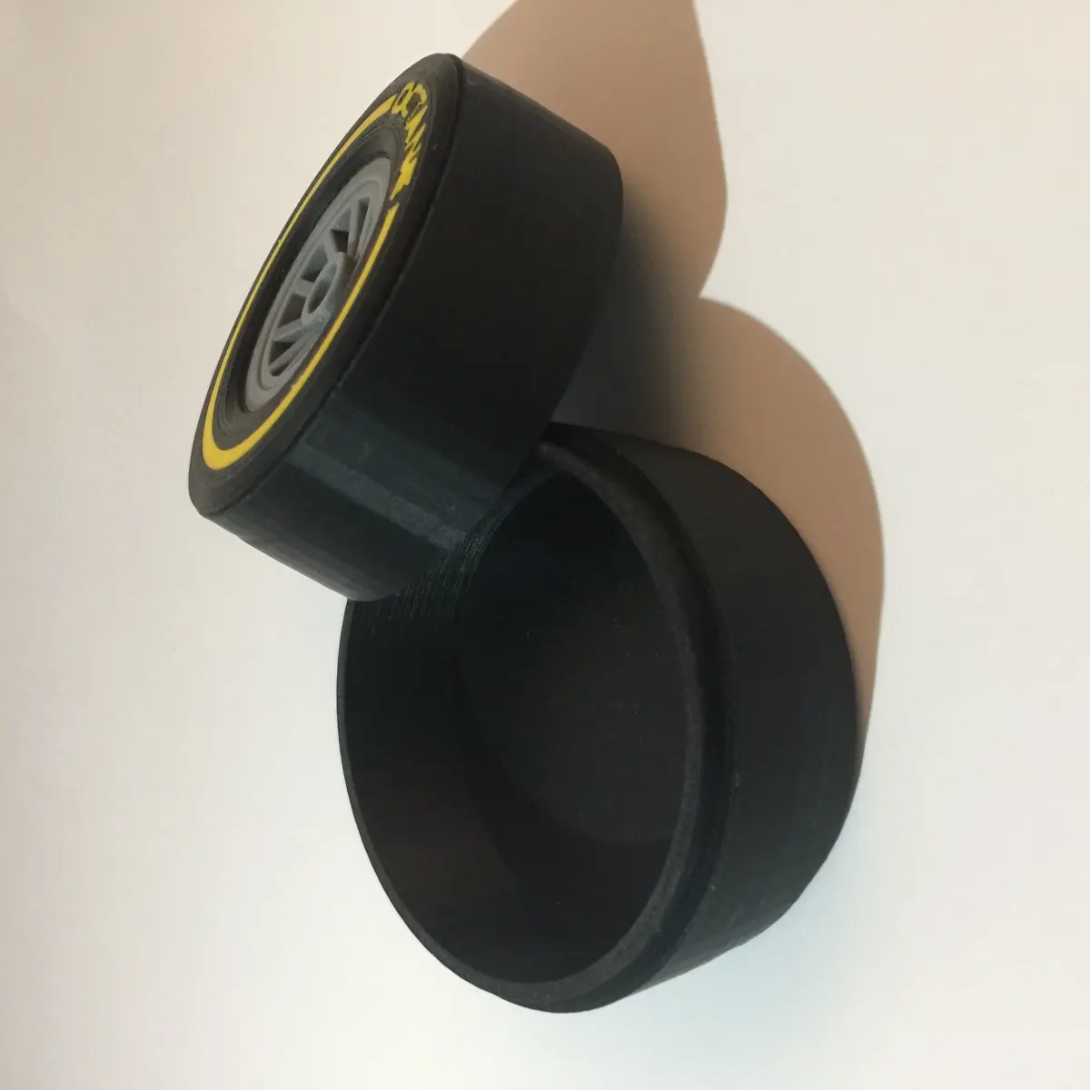 This latest Gift box is a representation of a Formula 1 rear tyre, and before anyone says anything.... yes, it's not 100% up to F1 regulations; it's too wide, the markings are different and... well, it's small and made of plastic. No judgement, dear reader; I'm a massive pedant too. This is a gift box for your favourite F1 fan, for a special ring for your special petrolhead or for any other application you want to put it towards. You can print it in four different tyre compounds (for you non F1 fans, that's the softness of the rubber the tyre is made from, designated by the coloured marking on the sidewall): White for hard tyres, Yellow for medium and Red for soft, or if you want it just to be purely decorative you can have it another colour (knock yourself out!).