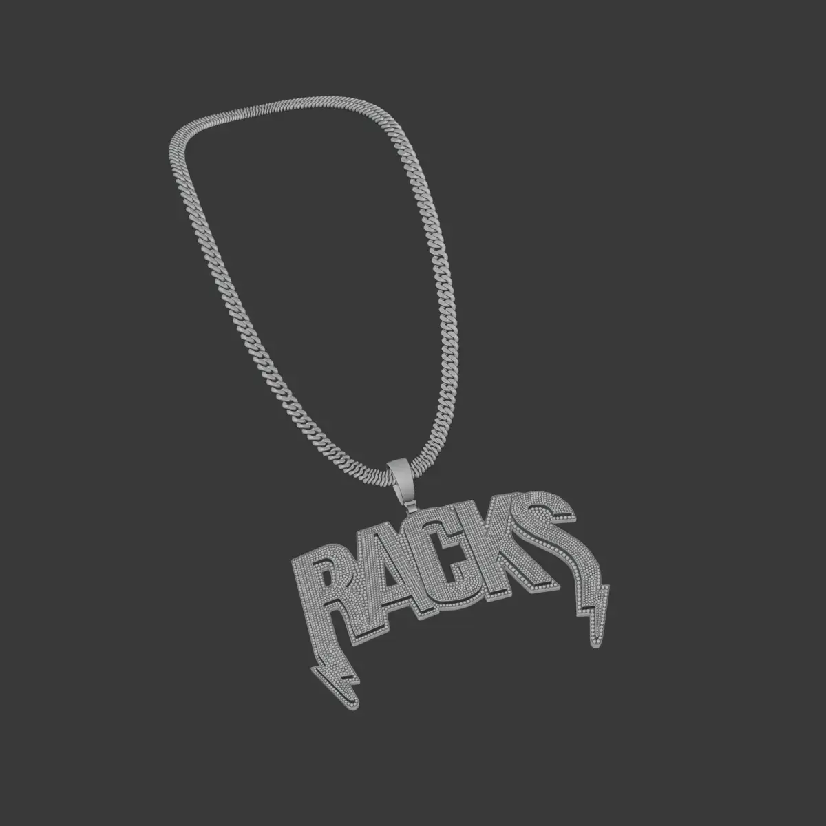 Description:High-quality 3D model of a luxury gold chain with a diamond RACKS pendant, perfect for hip hop, rap, and streetwear-inspired scenes.