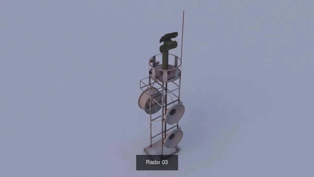 This is a set of 5 type of Radars and a Radar tower . All model is lowpoly with PBR 2048 textures.