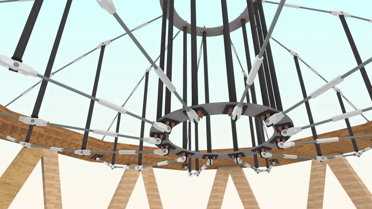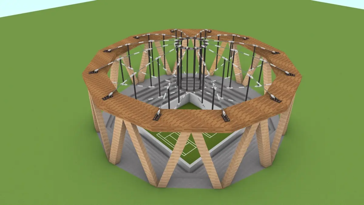 This building is of steel (S) and wood construction. It has one floor with a height of 3.2 meters. The building spans 100 meters in both the long and short directions, with column spacing of 300 millimeters. It features a radial cable system and incorporates wood as a material.This 3D model is an original creation of mine based on my own knowledge and research.