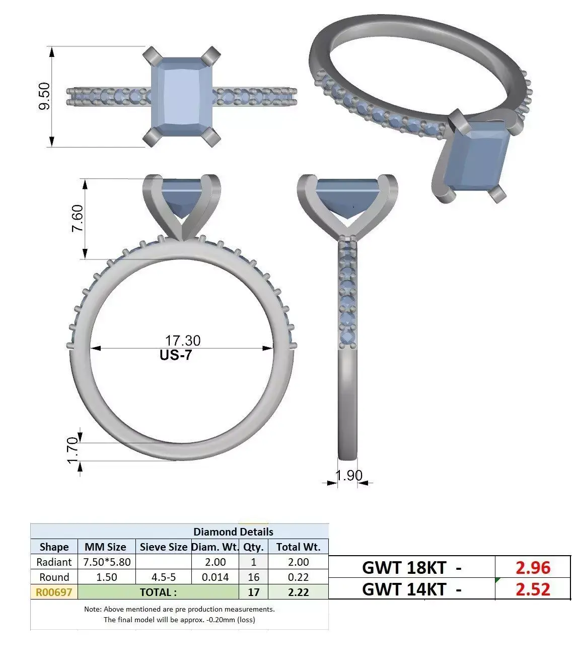• Clean, production-ready geometry• Secure four-prong radiant setting• Precision pavé stone seat layout• Reinforced gallery support structure• Optimized wall thickness for casting• Smooth comfort-fit inner shank• Editable Rhino source file included• Suitable for gold, platinum, and silver