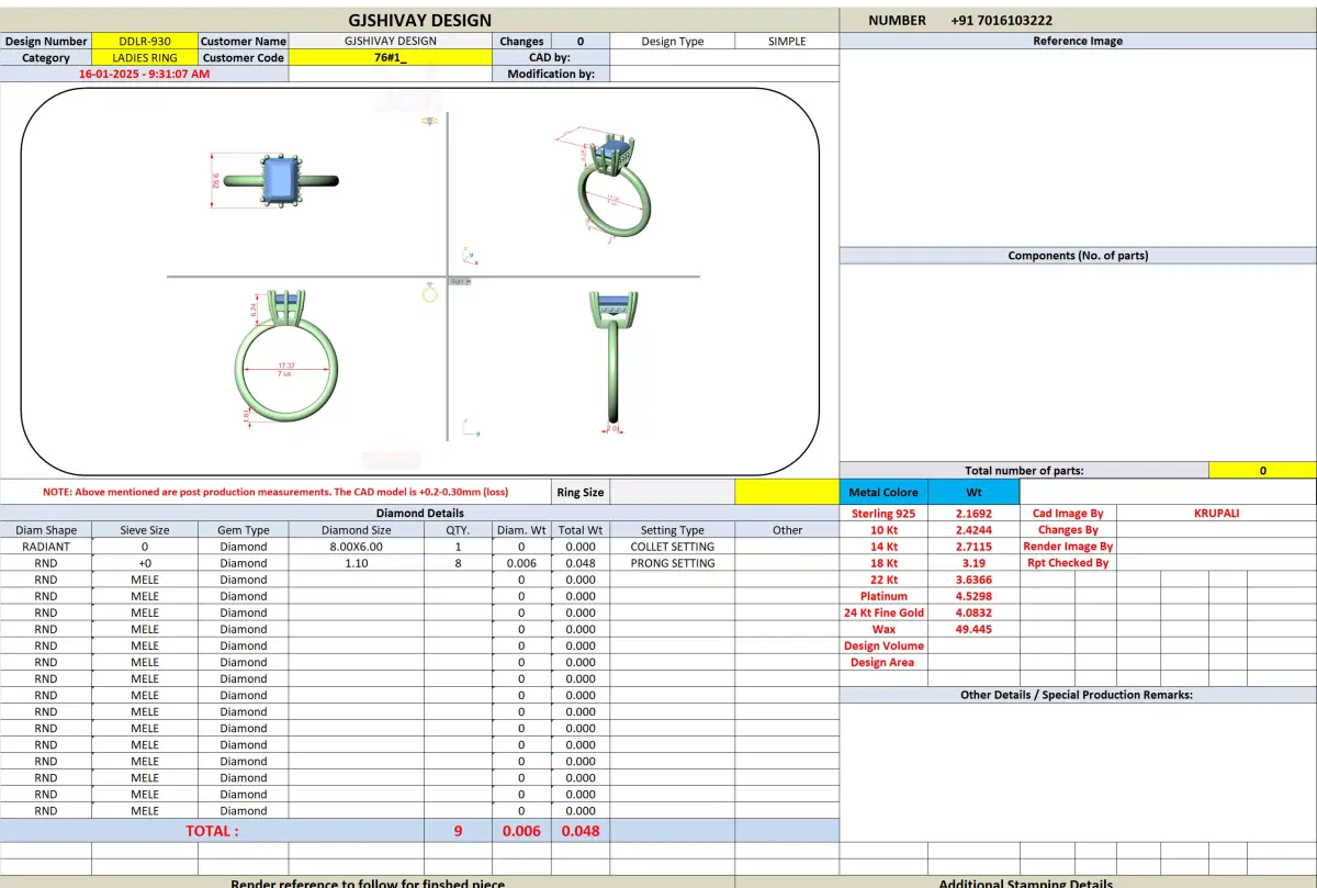 For center stone size adjustments, ring size modifications, metal weight estimation, or custom design changes, please contact us. Professional CAD customization support is available to ensure smooth jewellery production.