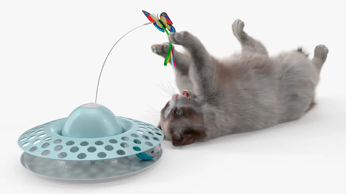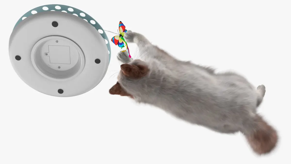 The ragdoll cat, originating in the United States, is a large domestic breed with silky fur and striking blue eyes. Interactive toy that features a base with a butterfly attached to a spinning wire. The colorful butterfly hovers and flutters, enticing cats to chase and play. The durable design ensures it withstands energetic play sessions, while the stable base prevents tipping.