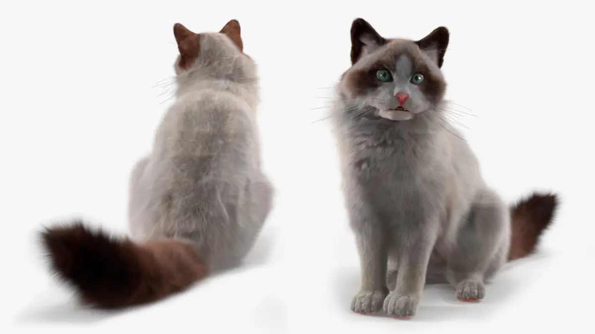 Ragdoll Cat Sitting Pose Fur for Maya is a three-dimensional model of Ragdoll, which is a large and affectionate domestic cat breed known for its striking blue eyes, semi-long silky fur, and gentle temperament.