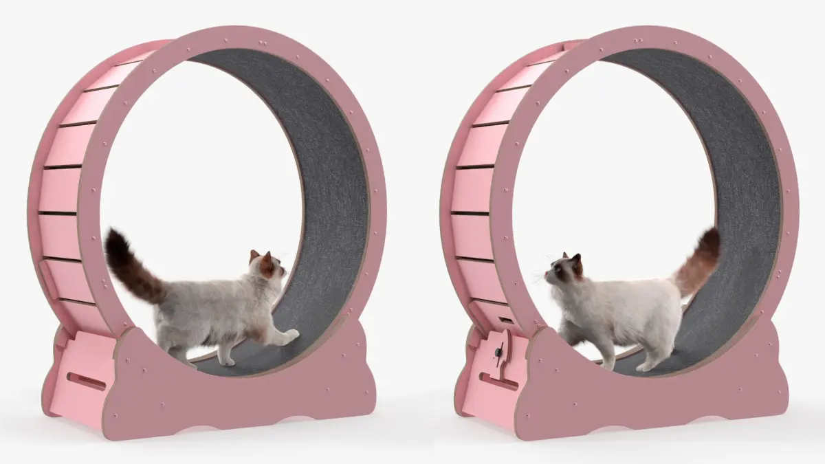 Ragdoll Cat Walking on Exercise Wheel Fur for Maya is a three-dimensional model of rotating pet running wheel with a ragdoll, which is a large and affectionate domestic cat breed known for its striking blue eyes, semi-long silky fur, and gentle temperament.