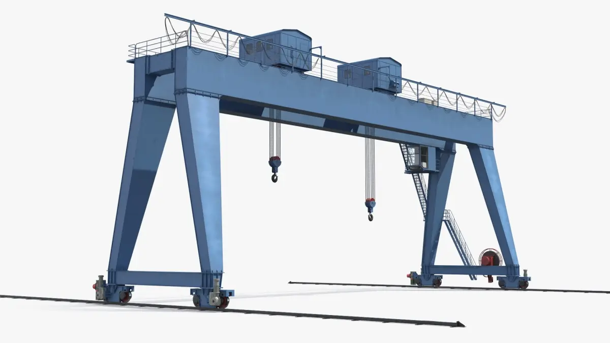 Rail Mounted Double Girder Gantry Crane Blue Simplified is a three-dimensional model of industrial crane structure, designed for lifting and transporting heavy loads in various settings.