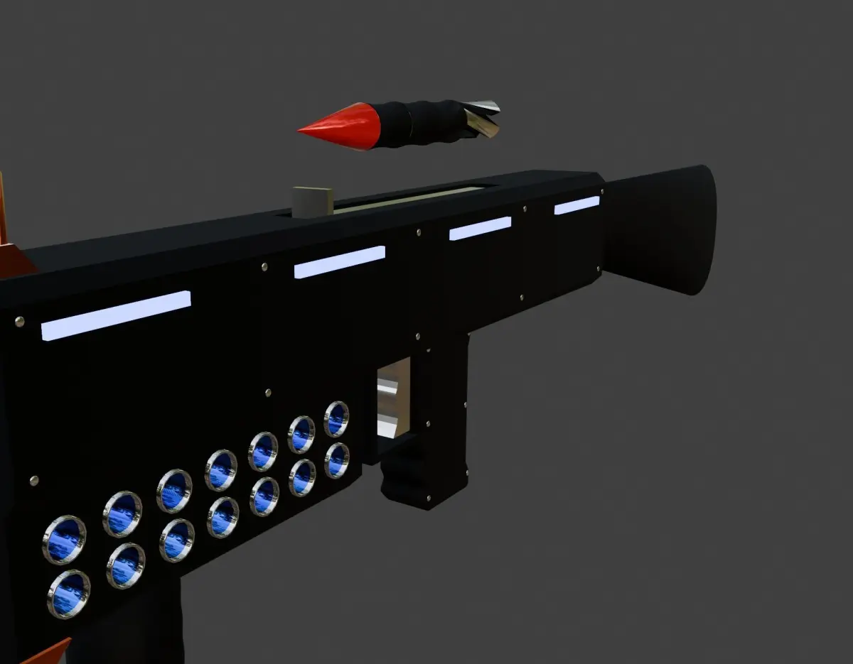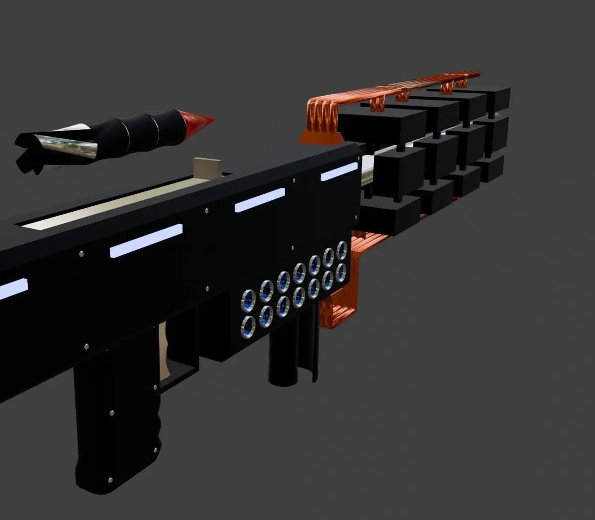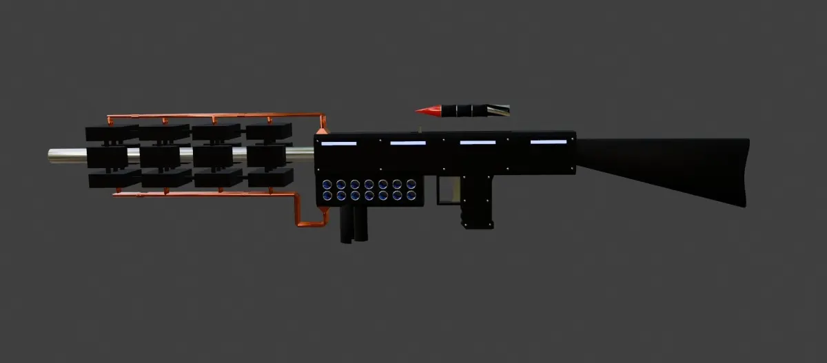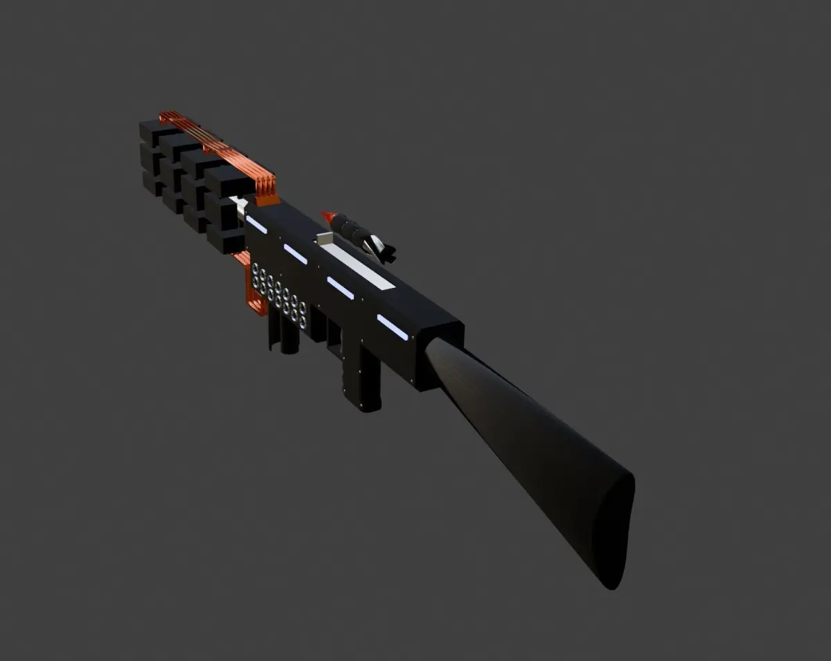 The 3D model of the Railgun showcases an advanced, futuristic design with exposed copper wires and a detailed railgun bullet. The sleek body and intricate wiring highlight its high-tech functionality, while the precision-crafted bullet underscores its cutting-edge capability.