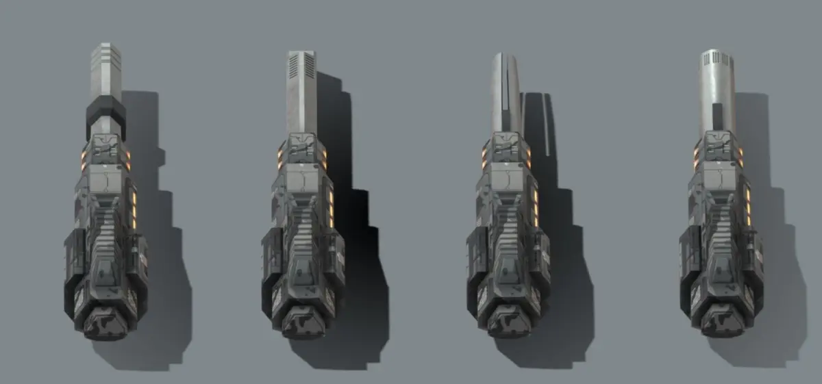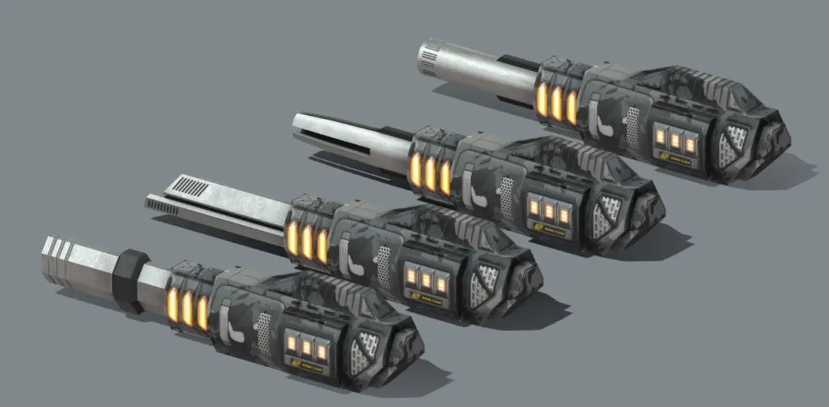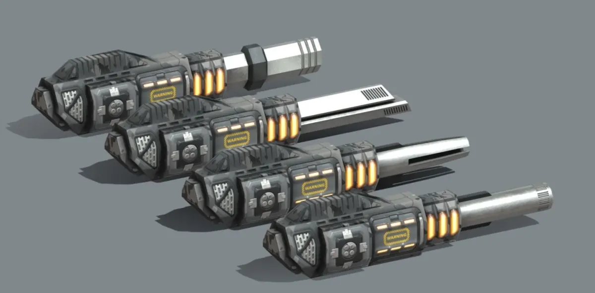 Railgun set shares same body for 4 different barrels which are seperate polygon mesh helps you to add recoil animations. It is designed as Low-Poly for mobile games.