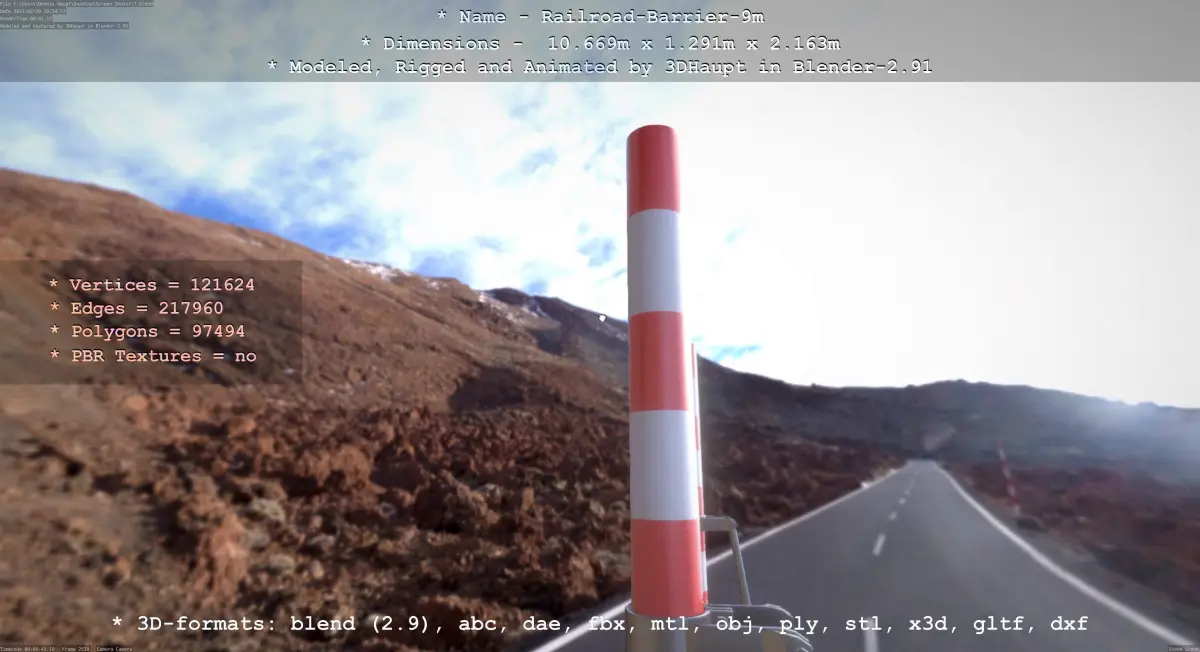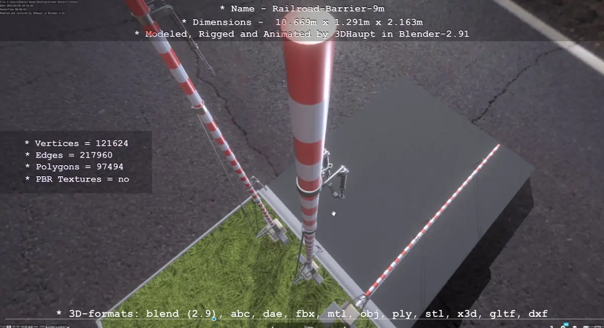 Here is the animated high-poly version of the railroad barrier with a range of 8 meters.Also included are two static non-animated versions, one with the barrier open and one with the barrier closed.Made with the Railway Barrier Construction Kit.