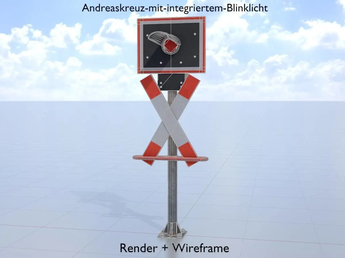 - Hier sehen Sie ein 3D-Modell eines Andreaskreuz mit integriertem Blinklicht.