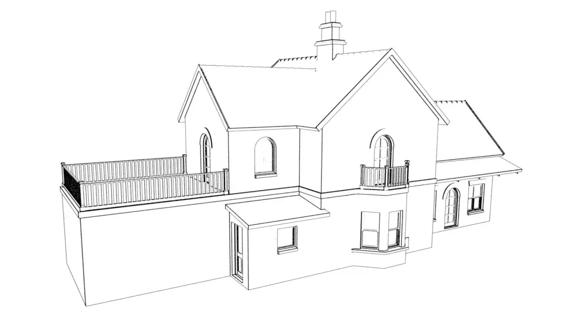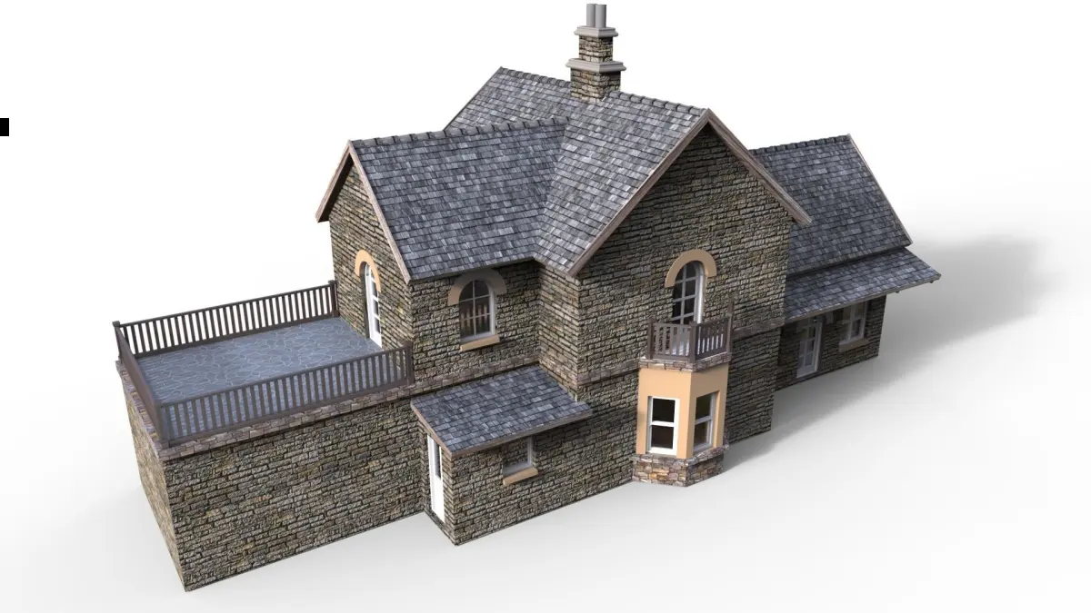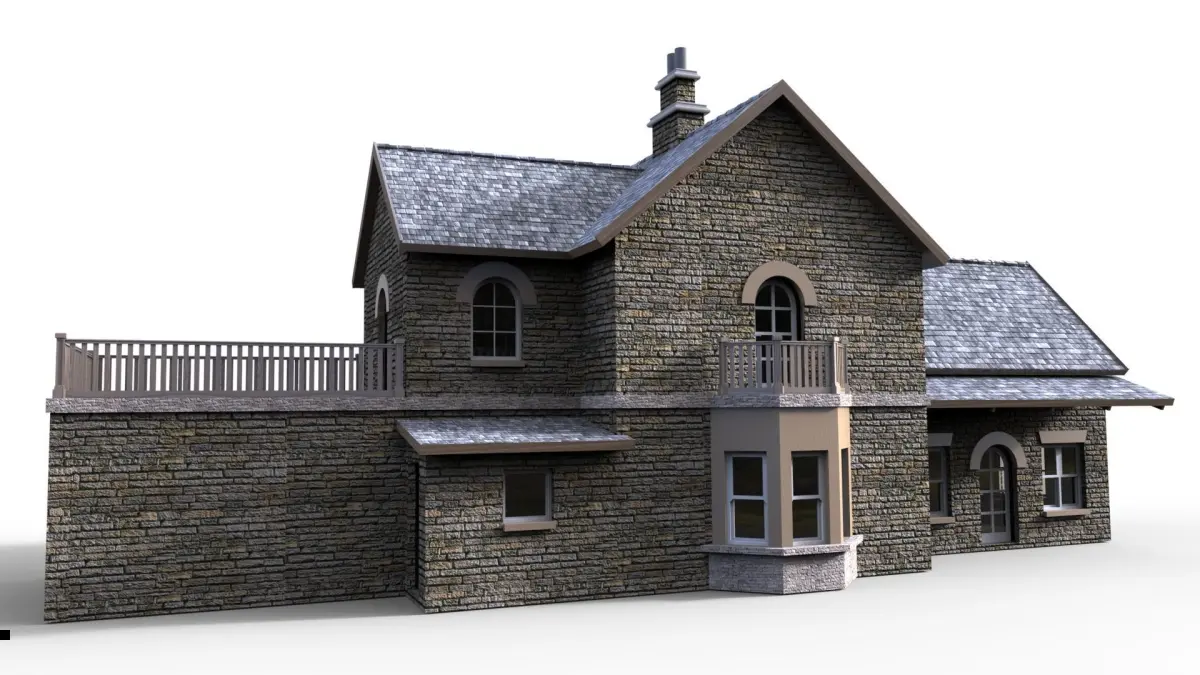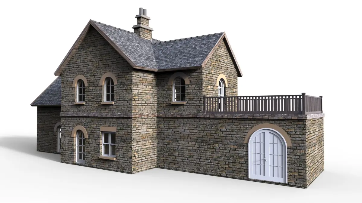 Railway station with historic design. Materials for building are brick, stone and wood. Material for roof is schindel.