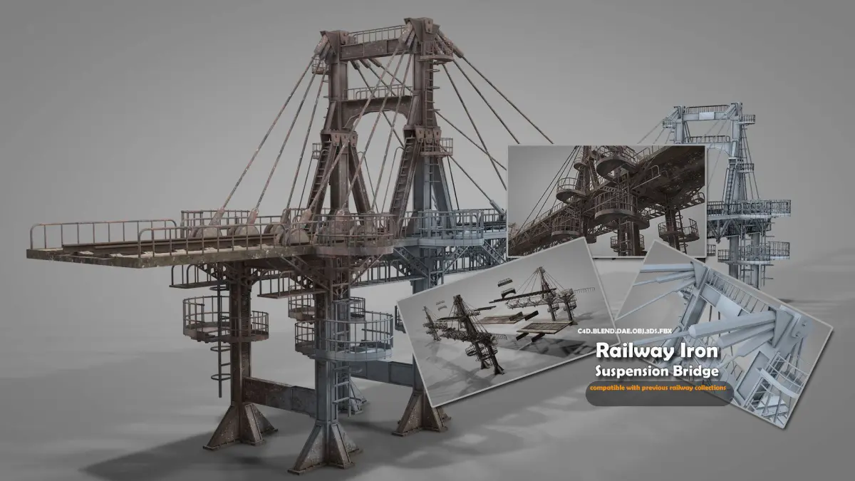This iron suspension bridge is a nice and detailed one which compatible with my previous railway collections and other bridges that I uploaded few days ago. You can have a great collection by purchasing these collections one by one. Groups or null objects are always missed in the OBJ files after the conversion but you can group them manually with a little effort:)