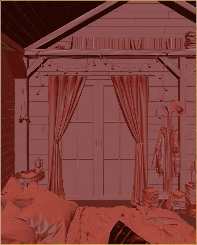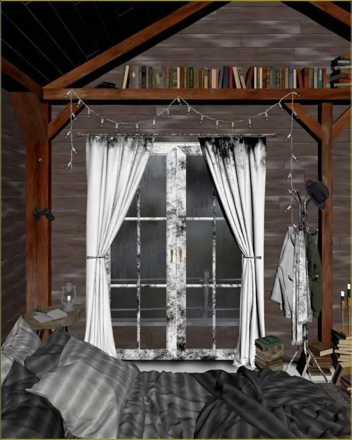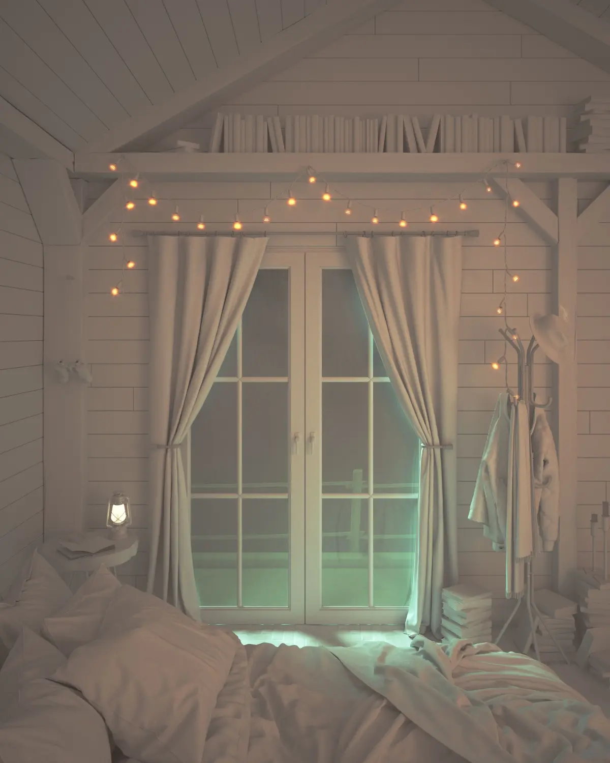 Cabin bedroom in the rain is an image I made inspired by a photo on the internet.