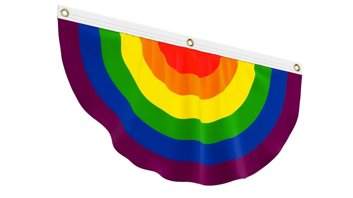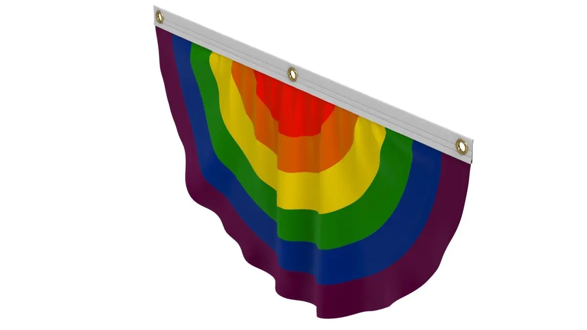 Rainbow Gay Pride Flag Bunting is a three-dimensional model of a pleated semi-circle flag, representing LGBT rights, the gay pride movement, the LGBT community, and the spectrum of human sexuality and gender.The rainbow pleated patriotic fan flag is an accessory that represents the LGBT community with its symbolic colors. The rainbow pleated semi-circle flag is a multicolored flag that represents the diverse community of lesbian, gay, bisexual, transgender (LGBT), queer pride, and LGBT social movements.