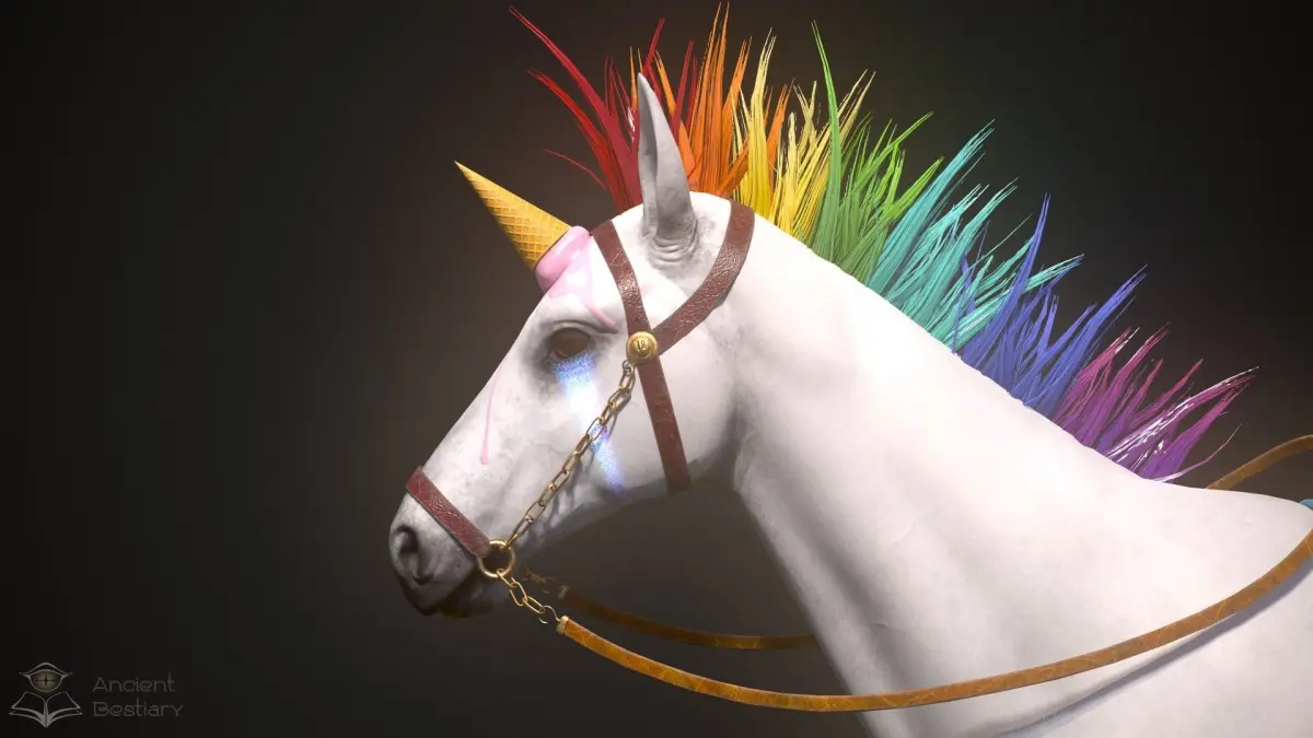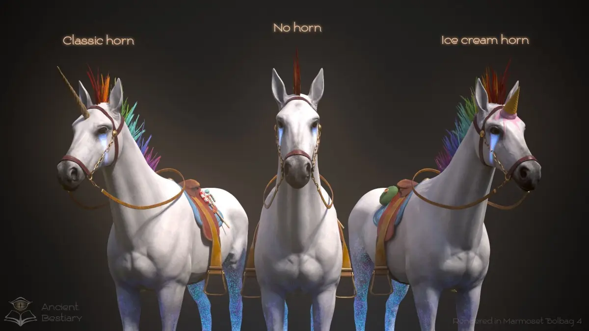 - 44k triangles skeletal mesh (body, jaw, tongue, eyes, saddle, sweets, bag, stirrup, reins, hair head, hair tail, tail band, ice cream horn, classic horn)