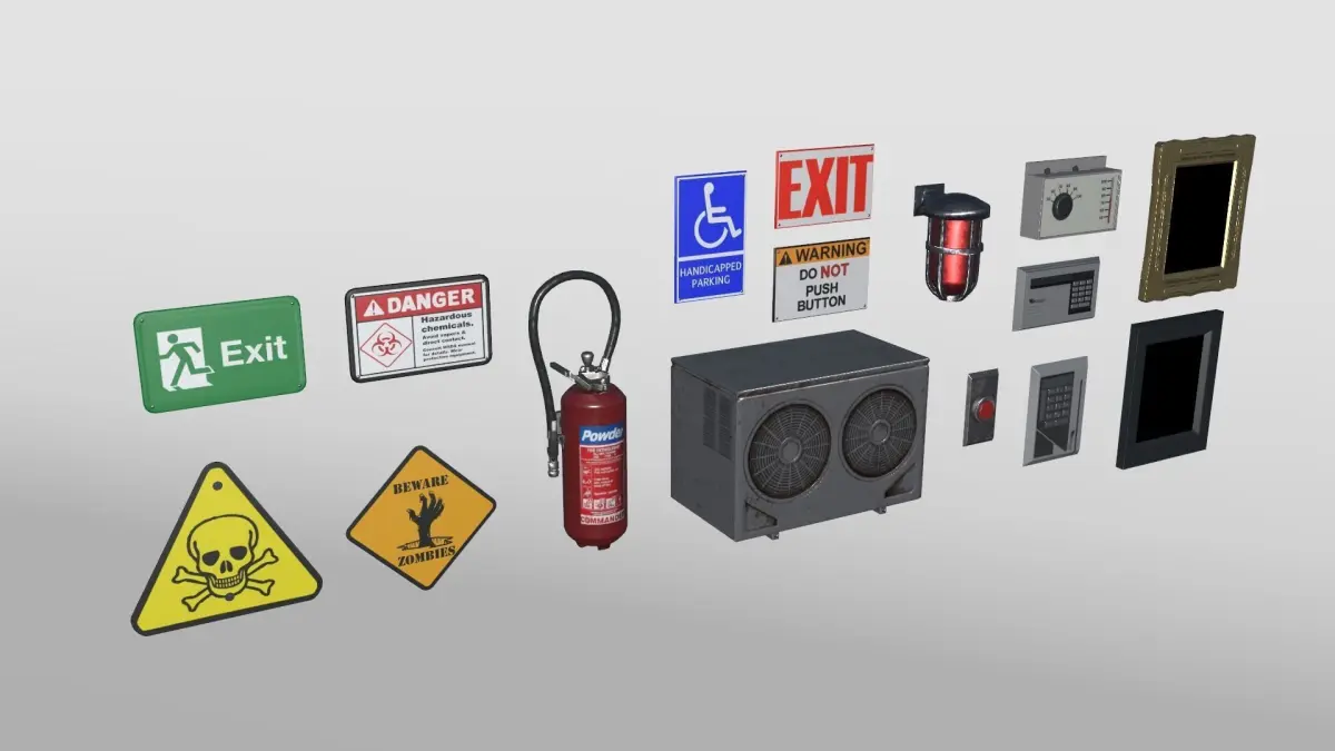 Roadside Assistance Kit # 1 contains a number of items for both interior and exterior environments that you would find in an industrial, construction, science, or other similar locations. Along with the more complex objects like the ac unit and fire extinguisher, included are 4 sign models that each have a number of different color textures for different scenarios that can be switched out with ease.
