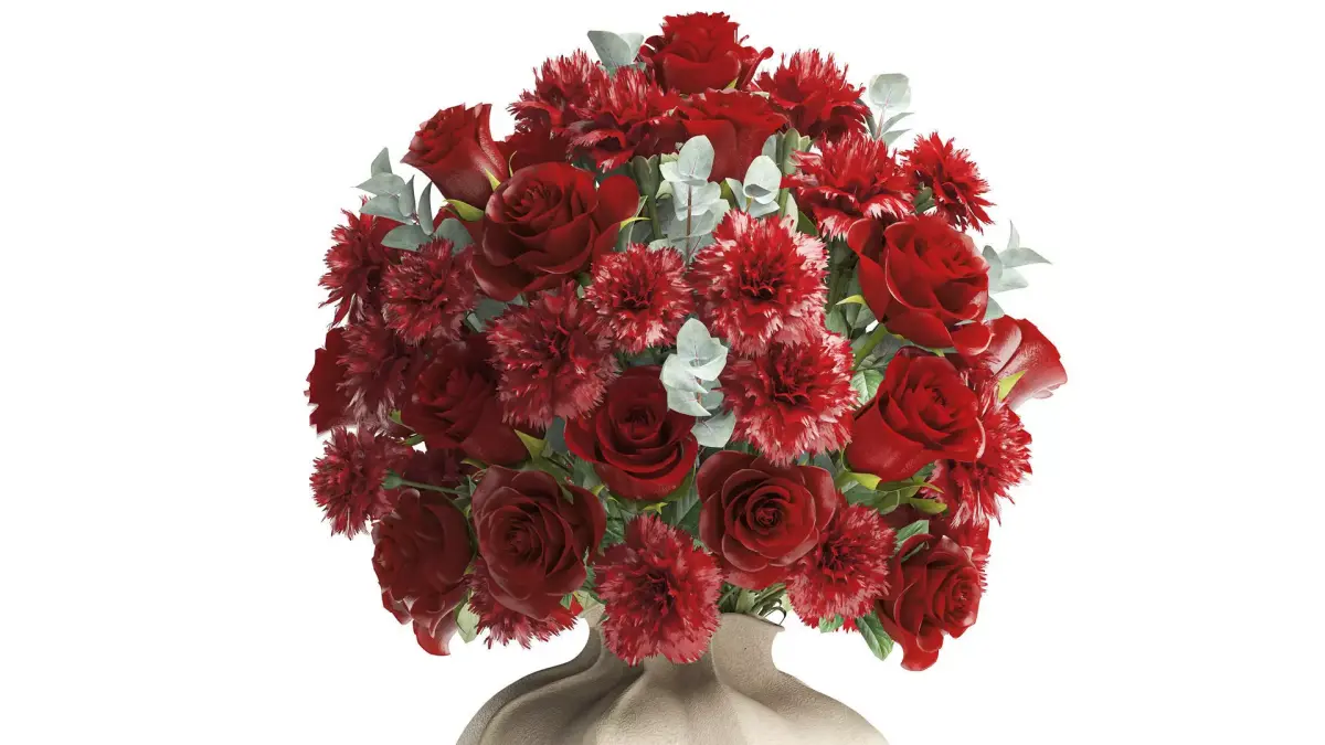 A realistic bouquet of red flowers (carnation, rose, and eucalyptus) in a modern ceramic vase. Set 702.Decorative bouquet of red flowers in a vase for decor and interiors. A formal bouquet of red flowers.Roses, vase, spring bouquet, eucalyptus, summerPink rosesDianthus caryophyllus - carnationEucalyptus - eucalyptusRoses, vase, spring bouquet, eucalyptus, decormodern, decorative, ceramic vasedesigner bouquet, holiday bouquet, wedding bouquet, romantic bouquet, bouquet decoration, realistic bouquet, floristry, red, flowervasevases