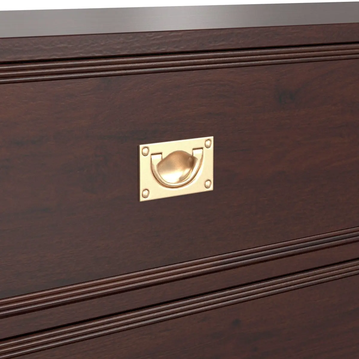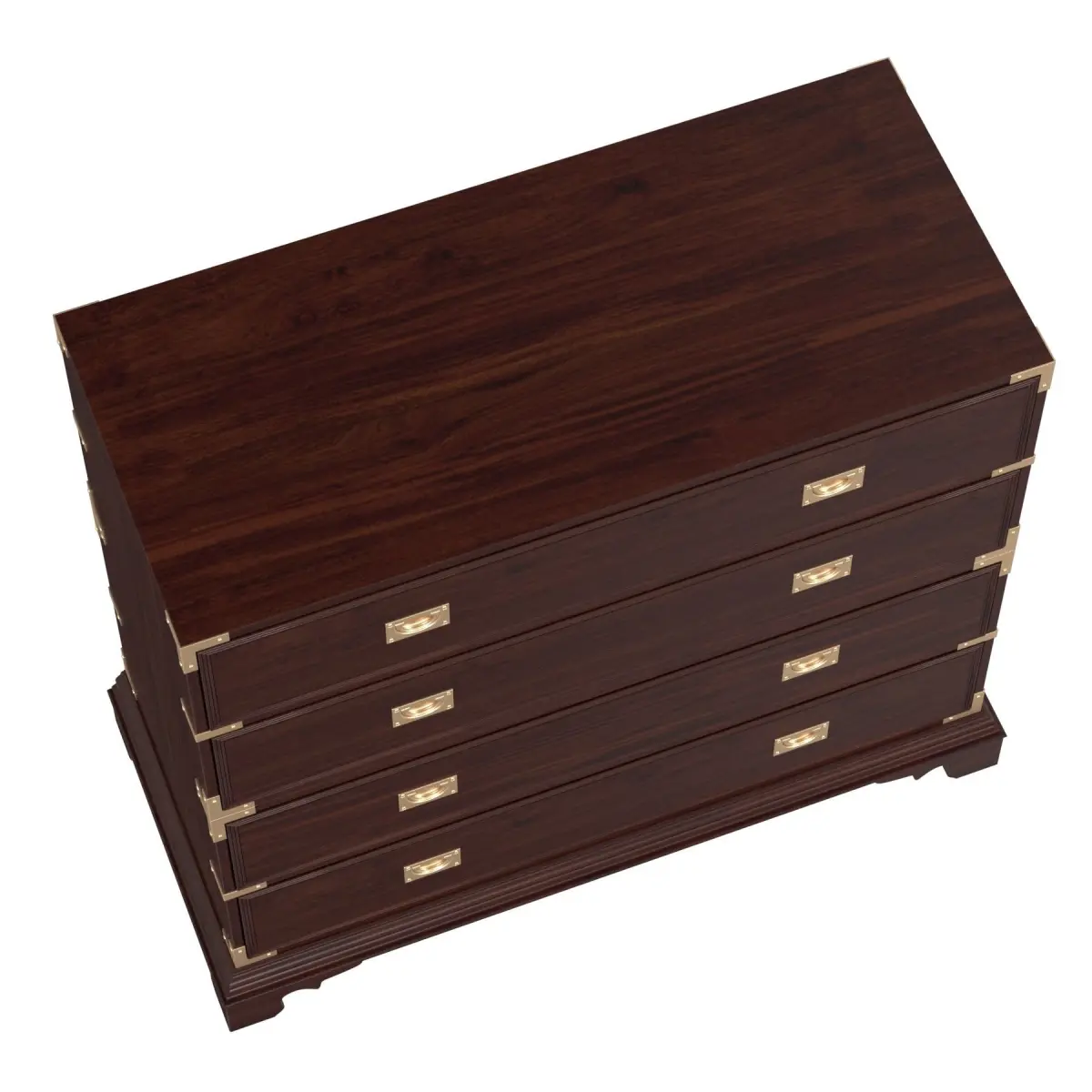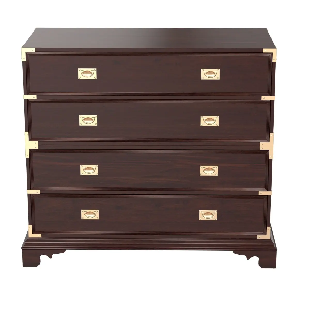 Original retail $11,945, timeless Ralph Lauren Campaign Style Mahogany Finished Shotwell Dresser, rubbed brass hardware and accents, four drawers, showroom floor samplebrown wood finish, metal brass bronze elements handles corners pulls DIMENSIONS50ʺW × 23ʺD × 44.25ʺH