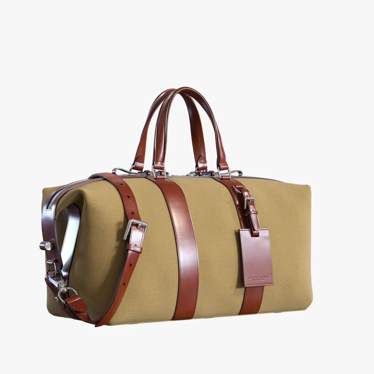 This is a realistic model RALPH LAUREN Leather-Trim Canvas Duffel.Removable, adjustable buckled leather shoulder strap, leather luggage tag,brass hardware with a palladium finish. This duffel is made from bonded cotton canvas and trimmed with leather.
