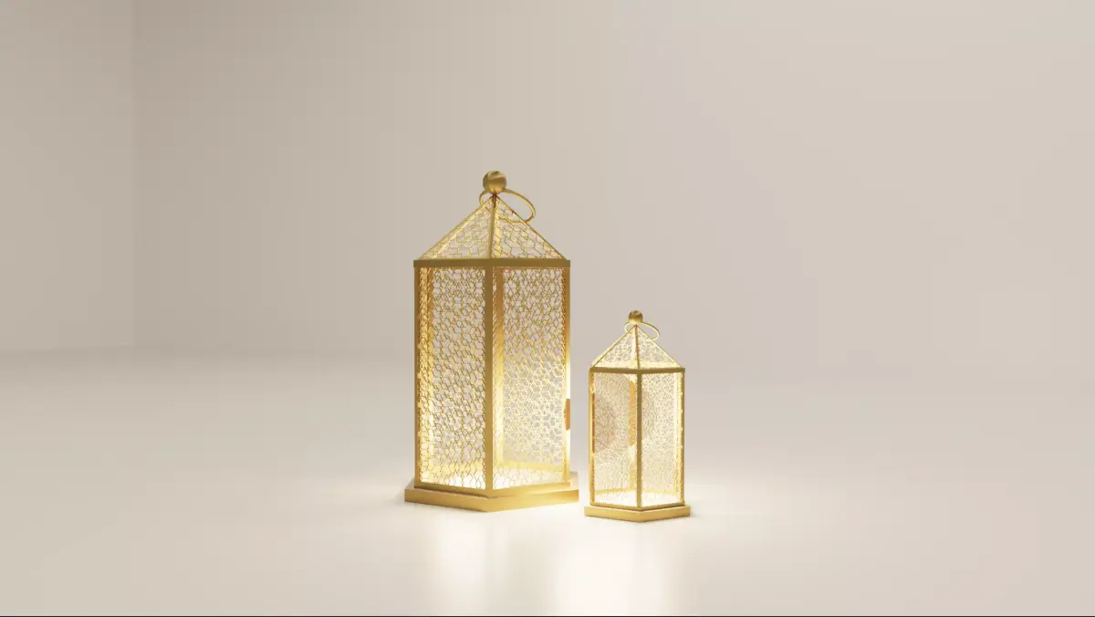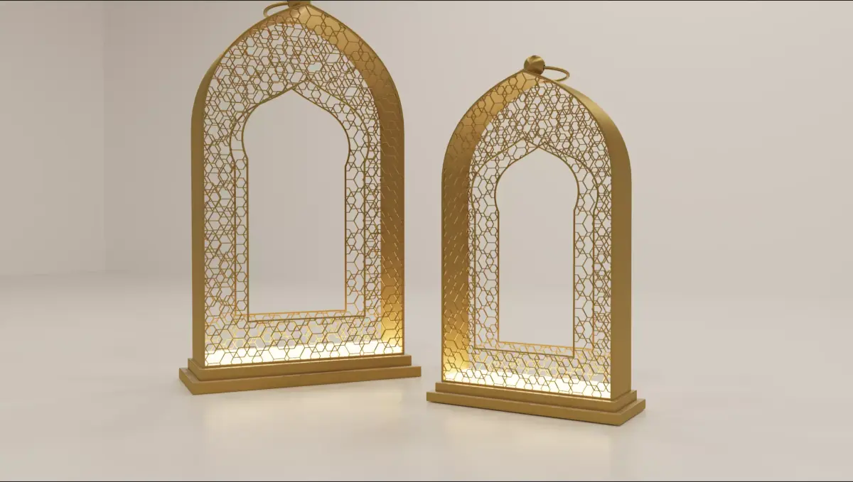 This 3D model set features a collection of elegant Islamic-inspired decorative elements, including ornamental arches, crescent motifs, lanterns, geometric cubes, and domed pillars. Designed with a premium gold finish and intricate patterns, these assets are ideal for festive scenes such as Ramadan, Eid, cultural exhibitions, luxury interiors, event visuals, and architectural renders.