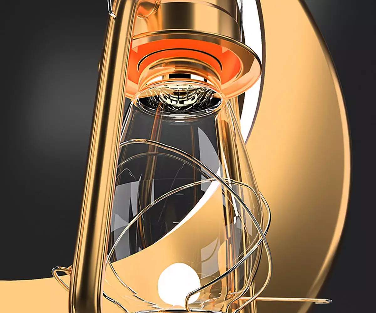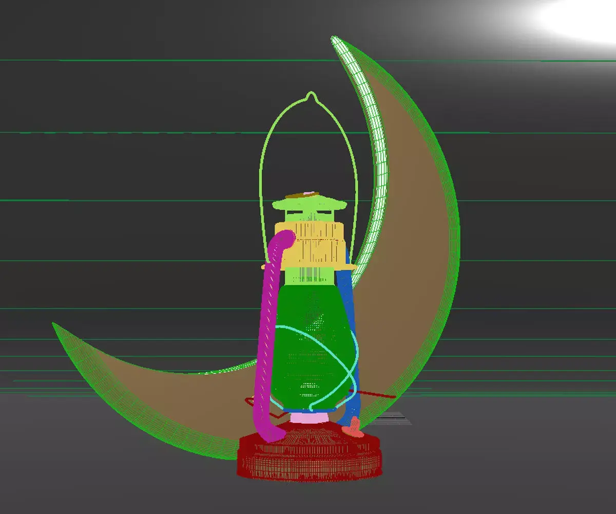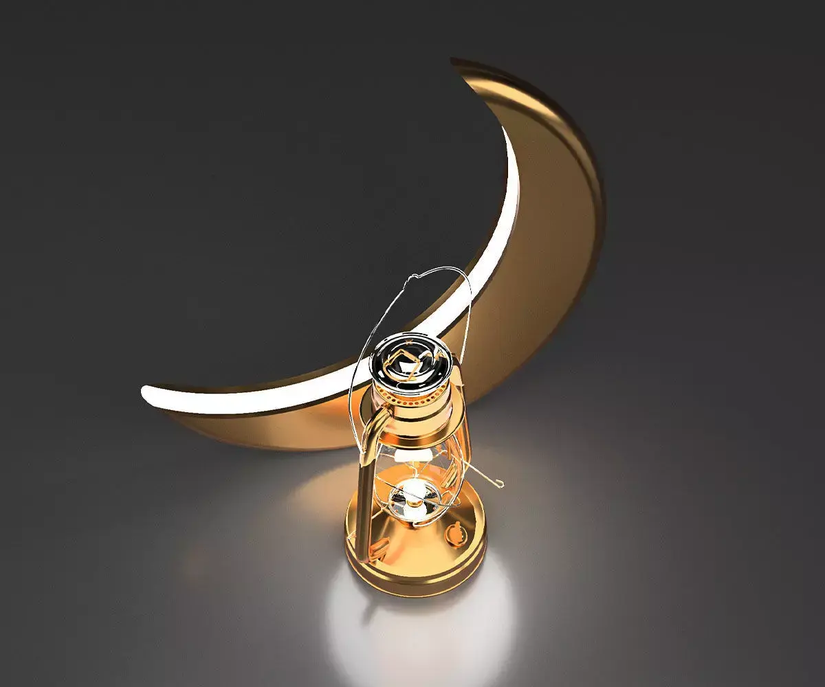 A glowing golden Ramadan lantern with a crescent moon featuring distinctive internal lighting. The materials and lighting are fully rendered using V-Ray.
