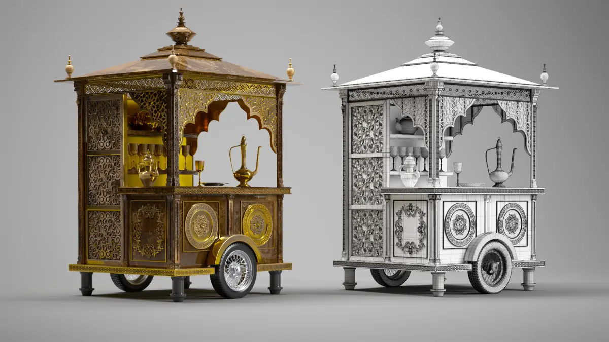 This is a highly detailed Eid-themed mobile cart, crafted with ornamental Middle Eastern motifs and PBR-ready textures. The model includes both textured (rendered) and wireframe versions, making it suitable for realistic rendering as well as technical visualization.