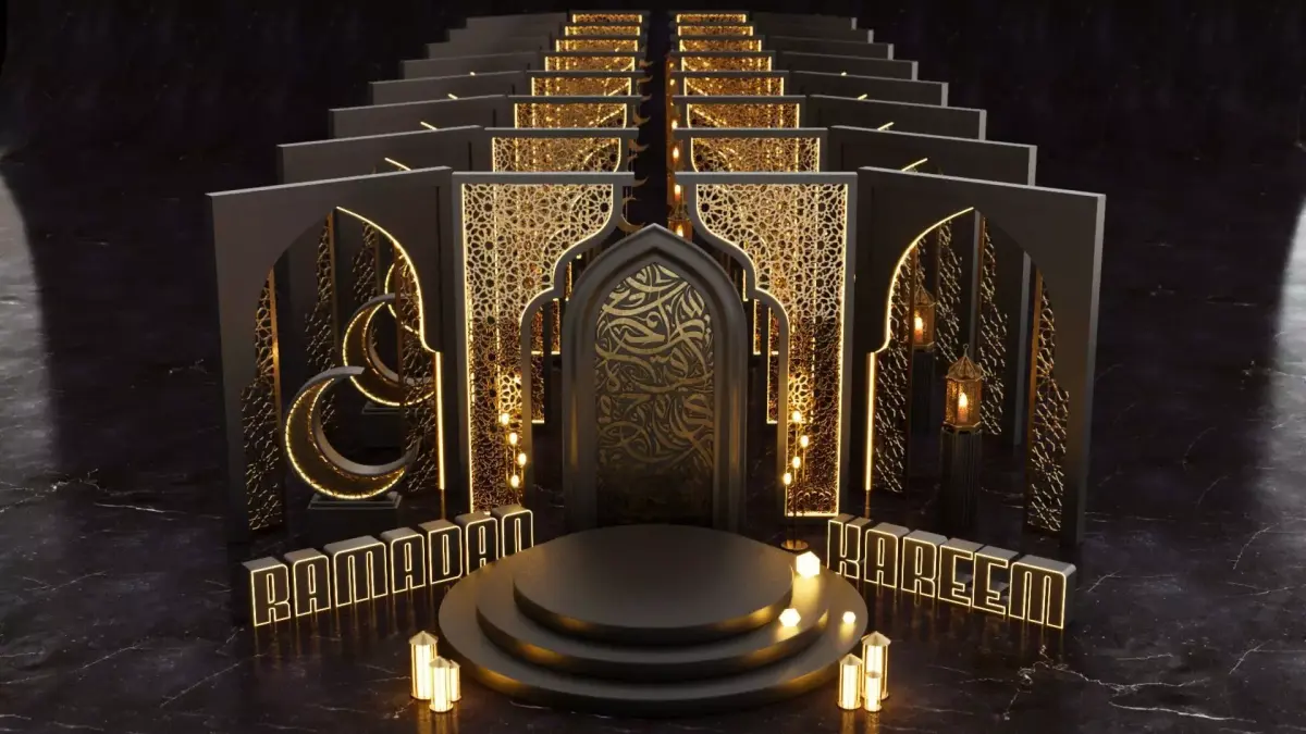 Luxury Corporate Ramadan Podium Stage Display is in a high-quality, fully detailed 3D scene designed for premium corporate Ramadan events, exhibitions, stage entrances, and festive installations.