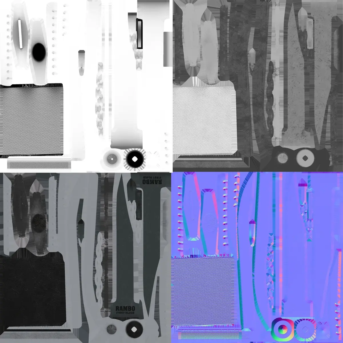 Rambo knife from the movie of the same name.Low poly model in 1194 polygons. 1 set of 5 textures 2048x2048 in TGA. format (Base Color, Metallnes, Roughness, Ambient Occlusion, NormaDirectX)