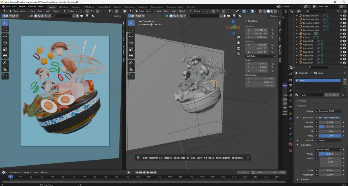 Features: High-Quality Modeling – Clean topology with realistic shapes and proportions. Photorealistic Texturing – Includes high-resolution PBR textures for detailed surfaces. Dynamic Composition – Floating ingredients such as noodles, mushrooms, eggs, corn, and sliced peppers create a unique and artistic presentation. Game & Render Ready – Optimized for real-time engines like Unreal Engine and Unity, as well as high-quality renders in Blender, Maya, and Cinema 4D. Multiple Formats Available – Ensuring compatibility with various 3D software.