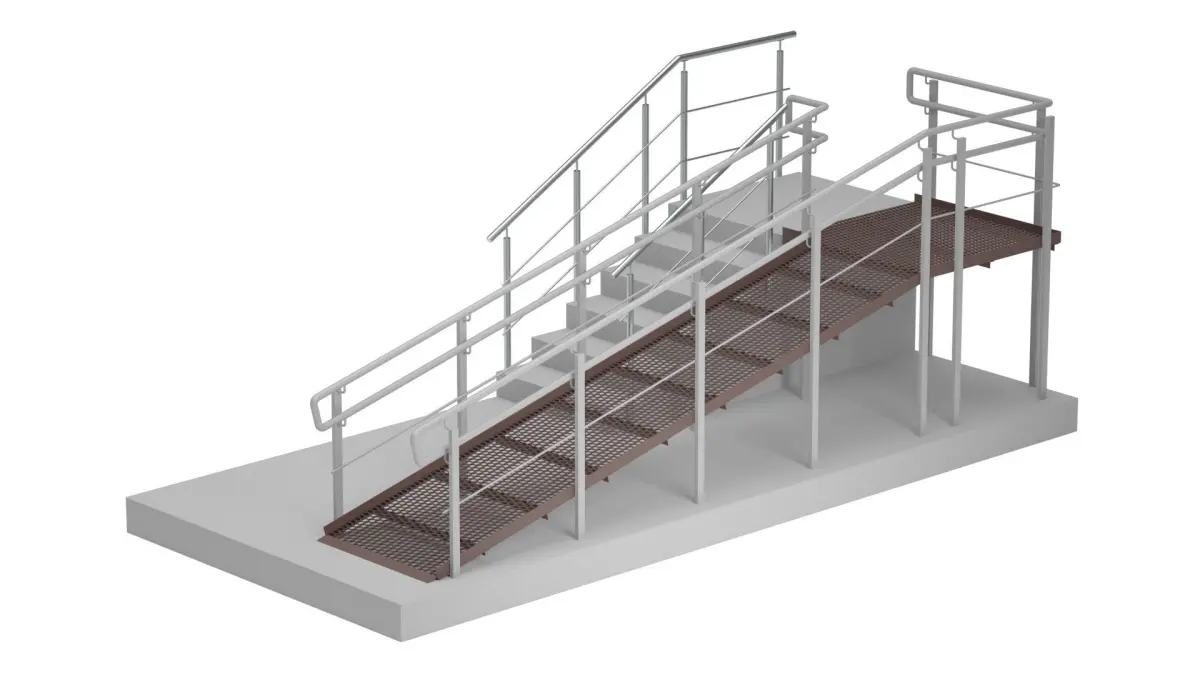 Metal ramp and stair. Metal railing. Perfect for public places (shops, supermarkets, medical clinics).