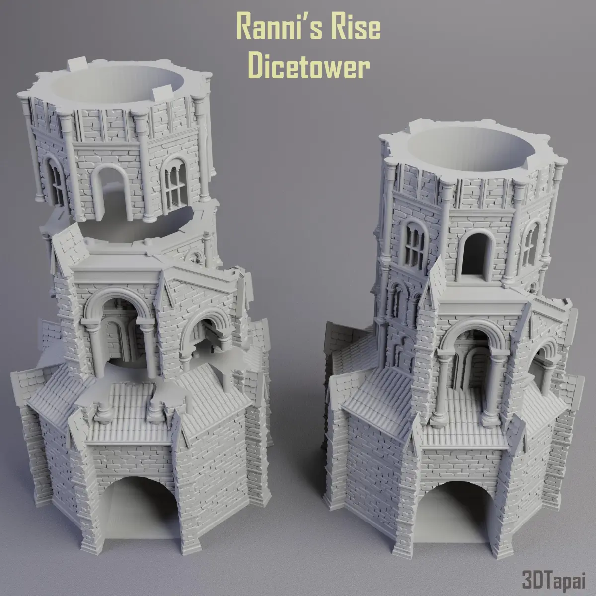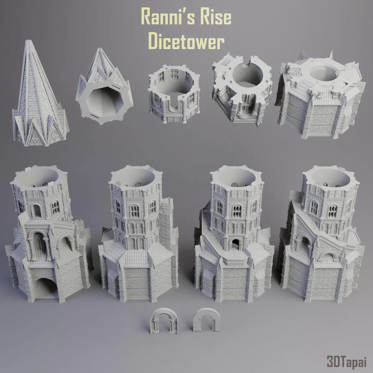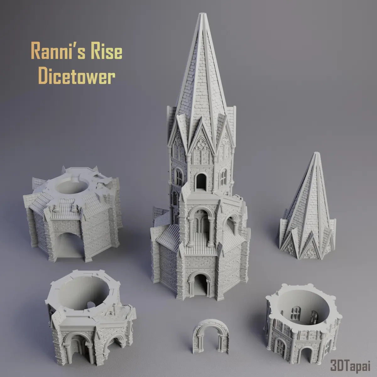 This is a model of Ranni's Rise tower from Elden Ring.It is a dicetower, sliced to parts, or as bigger pieces. It has removable gate part to provide way to a dice of standard size (used for DnD, or any standard 4-6-8-12-20 sided die). It has a removable roof part, that's where the dice goes in at the top!It also comes in a statue form, which means the whole model is in one piece, and it is filled out (not hollow).