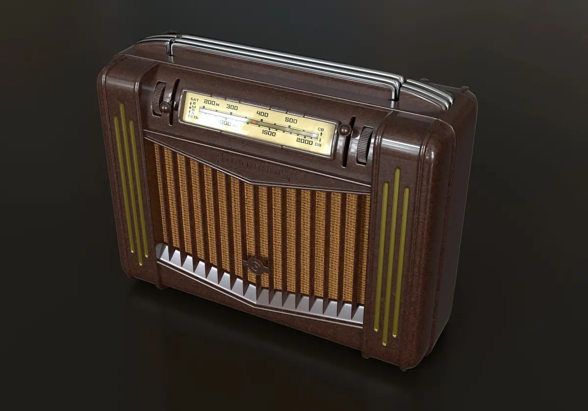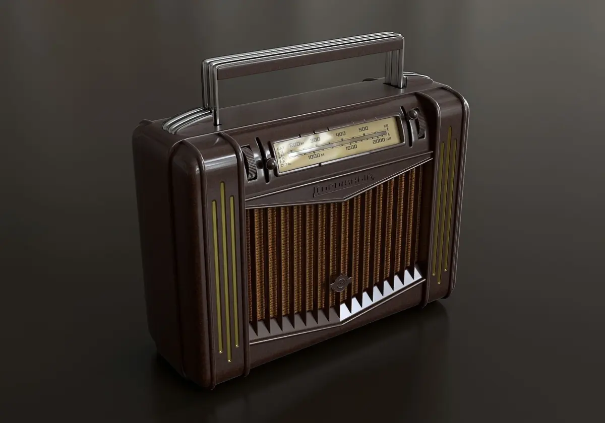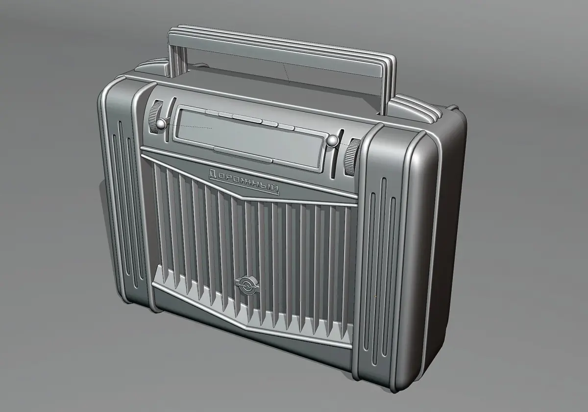 A rare plastic tube portable radio receiver from 1954. Original dimensions - 250x210x115 mm. The model consists of several meshes that are linked to the main body. The handle of the receiver can be pulled out and hidden.