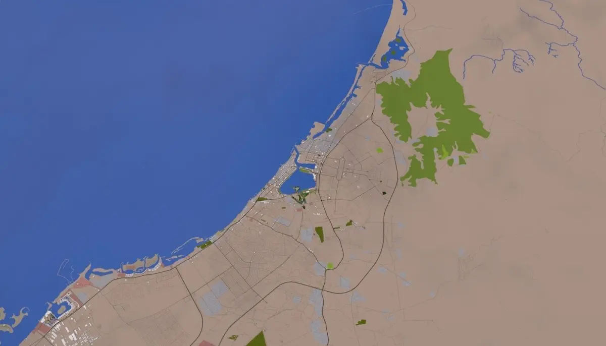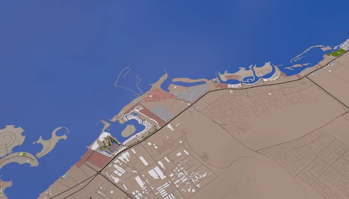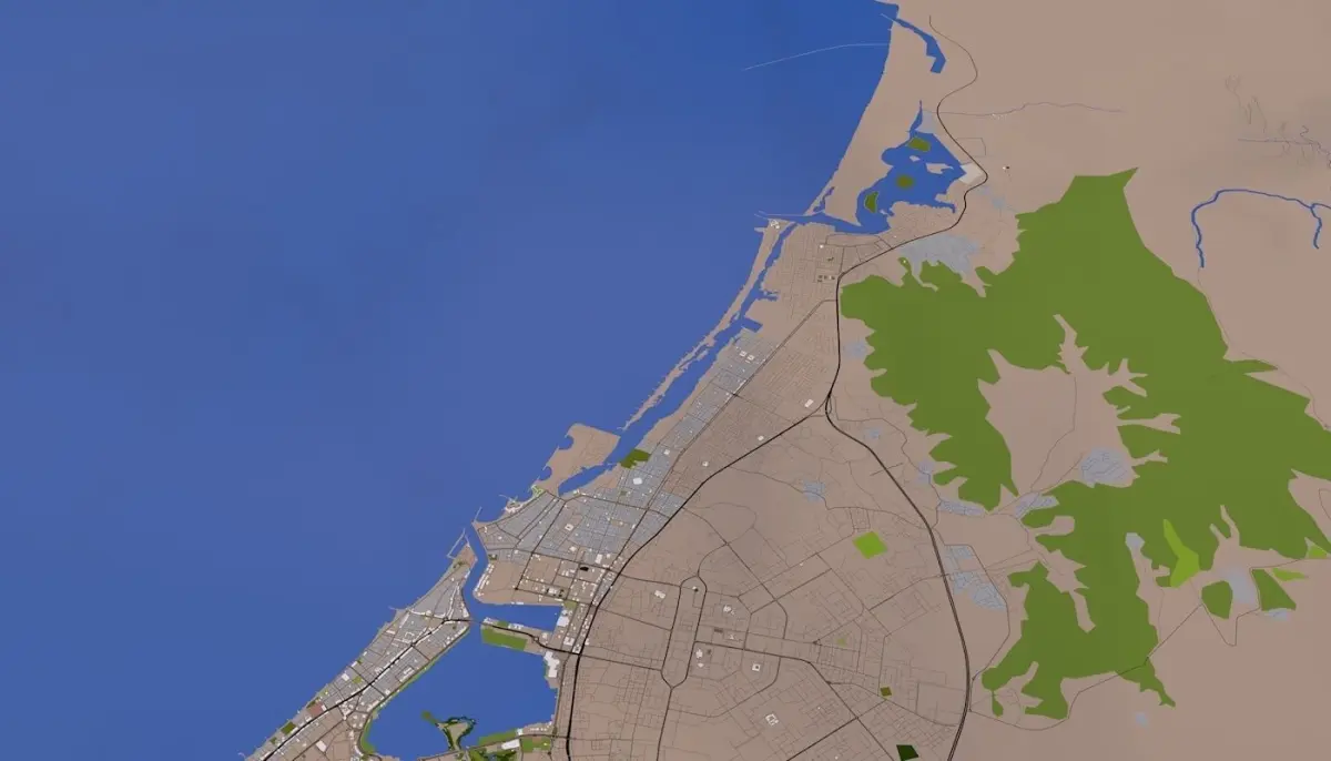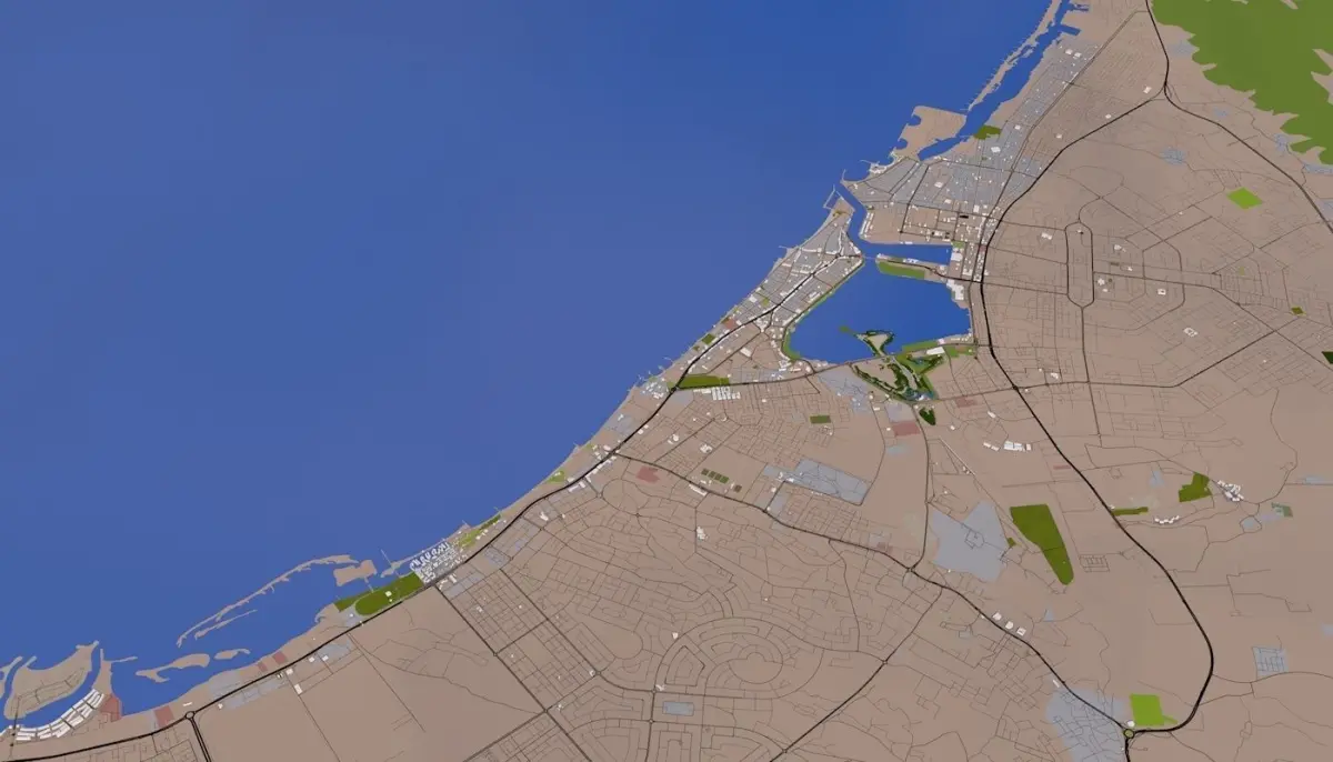 3D representation of Ras al Khaimah City_UAE using 2019 map data. Roads, railway, land, water, buildings are made using real world data. Buildings are accurately placed and resembles the real world object up to some extend. Please note that random buildings (varying height) are added to those area where real world data is not available.