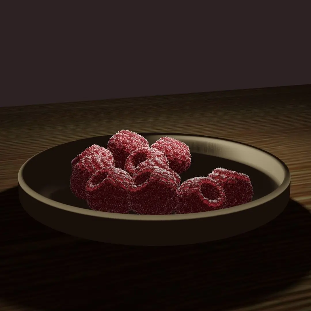 Here I drew a model of a raspberry, there are about 70k polygons in one raspberry.also made a small vessel and added some light for rendering.This model may be needed for a fruit salad, a garden, perhaps for advertising products that include raspberries