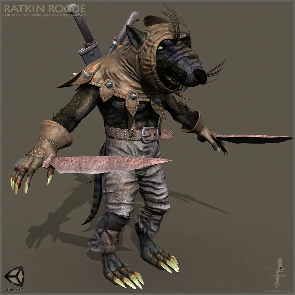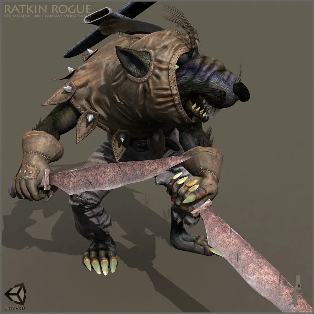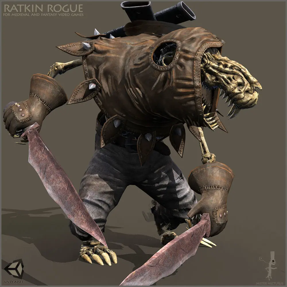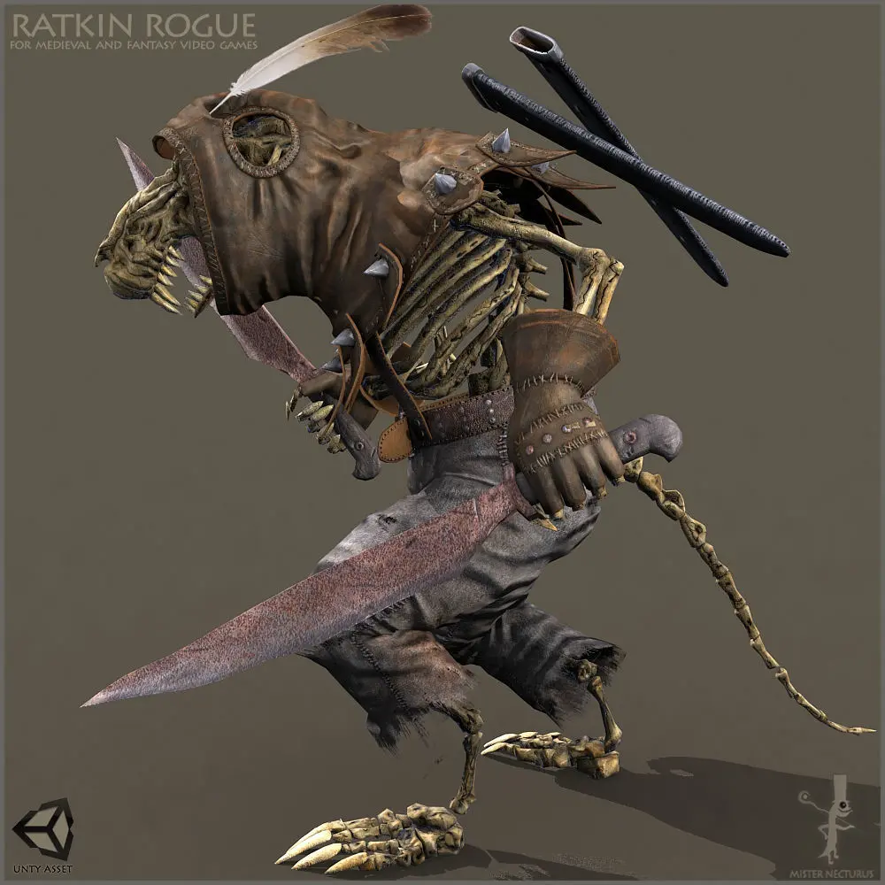 "Light" means rigged but not animated character in 3D MAX 2009. There are no Character Studio BIP animation clips in the pack as well. But animated FBX file is included. DAE (Collada) and OBJ are included.Unity Asset included.Unreal Asset included.Unreal Technical Details:Scaled to Epic skeleton: YesRigged: YesRigged to Epic skeleton: NoAnimated: YesNumber of characters: 2Vertex counts of characters: 12,052 (LOD 5,144 vertexes)Texture Resolutions: 512x512, 1024x1024, 2048x2048 and 4096x4096Number of Animations: 66 animations.Animation types: on place animationsIntended Platform: PC / MAC / XBox1 / PS4Platforms Tested: PCDocumentation Included: Yes Important\Additional Notes: PBR materials setup, Physics Asset setup included LOD version included 3D MAX 2009 file with rigged character includedBlueprints of modular character and skeleton includedMaterial instances of body and armor includedI used Character Studio 3D MAX to make animationsThere are 3 different ratkin body color textures included.Skeletal undead character version included.Low polygonal character version (LOD) included (not for skeleton).Skeletal version included.There are 3 different ratkin body textures.