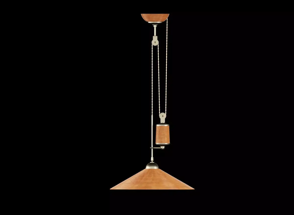 Rattan and brass ceiling lamp with a weight to modulate the height. France, 1960s.Dimensions:Height (cm): 102Diameter (cm): 50
