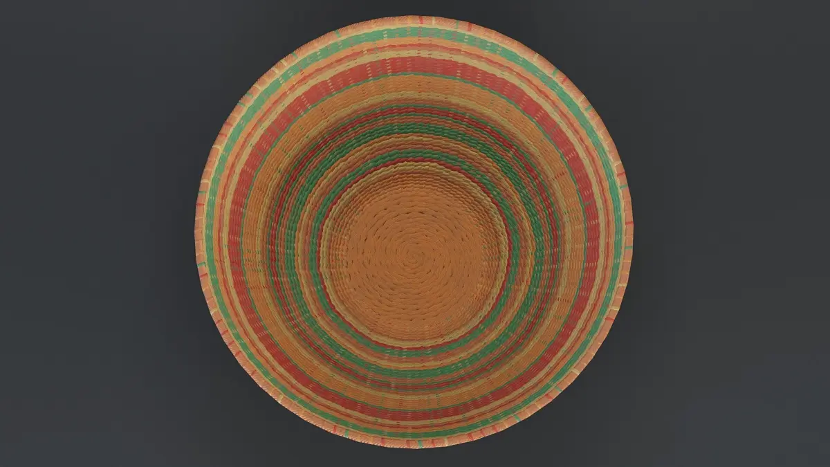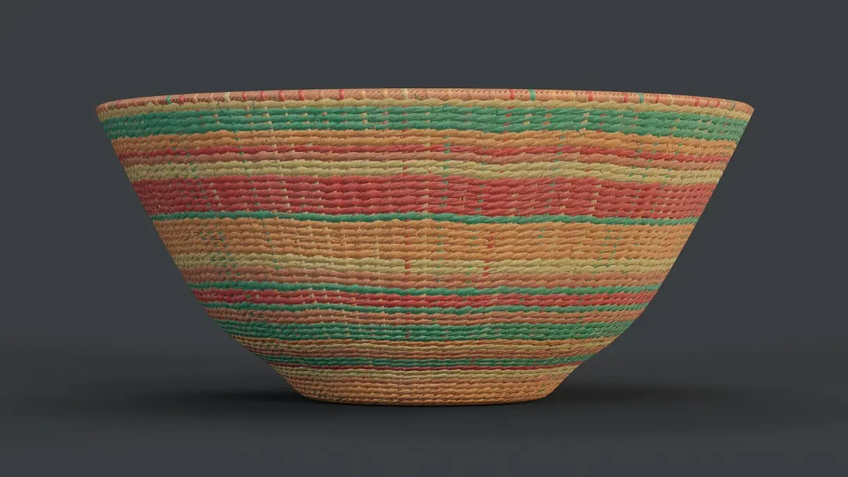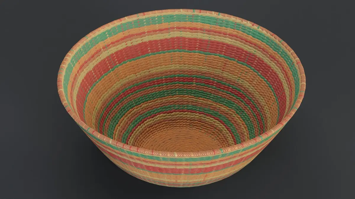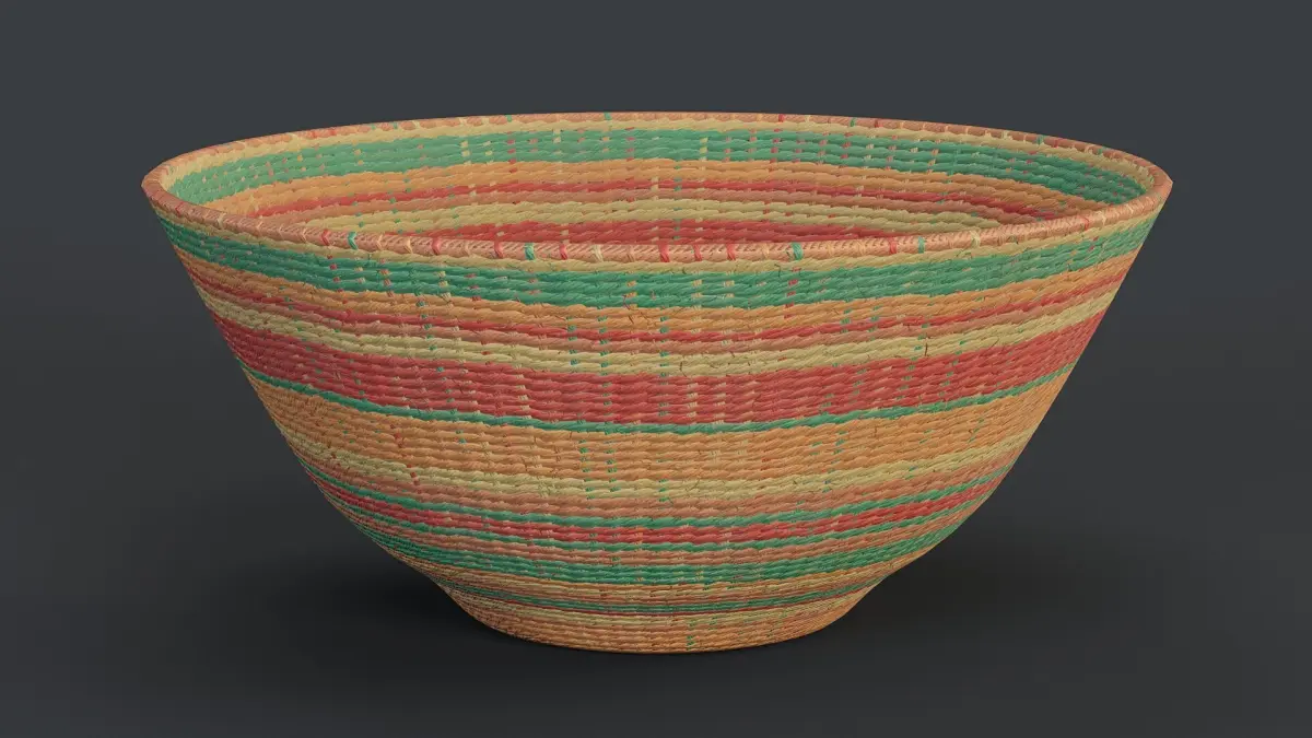 Digital 3D model of colourful rattan bowl. The model is low-poly with baked details from a high-poly object. Suitable for games and other real-time applications.