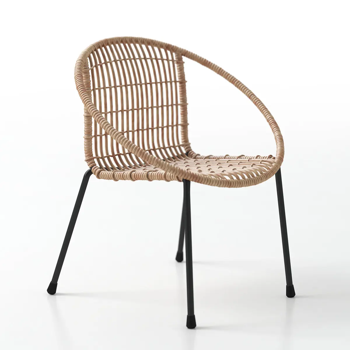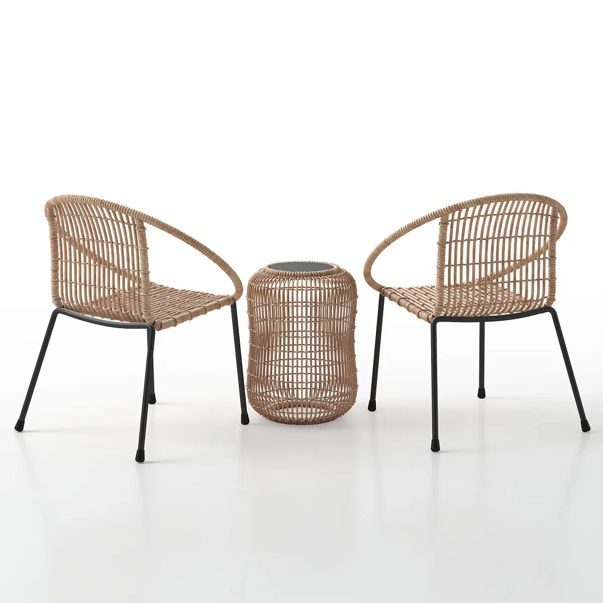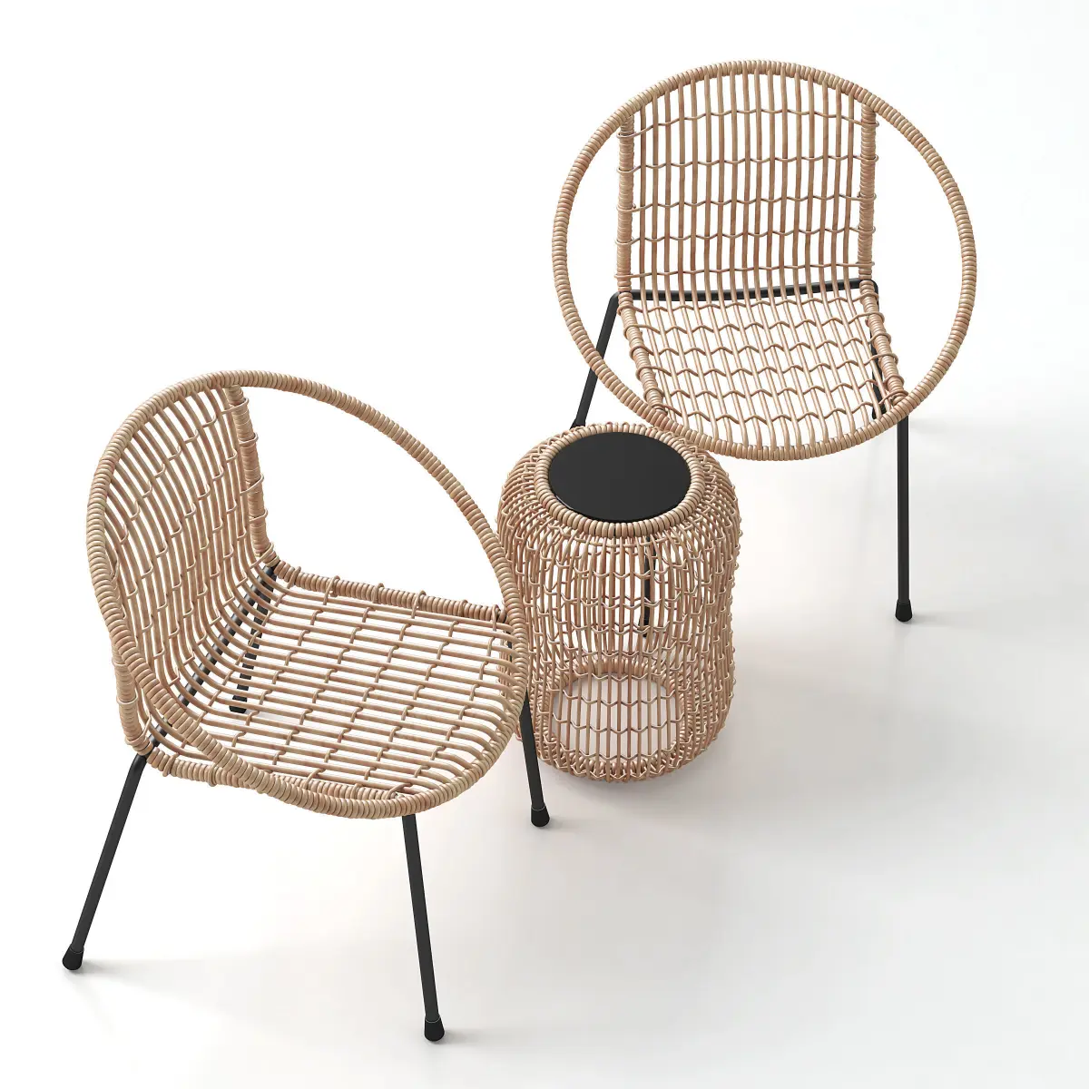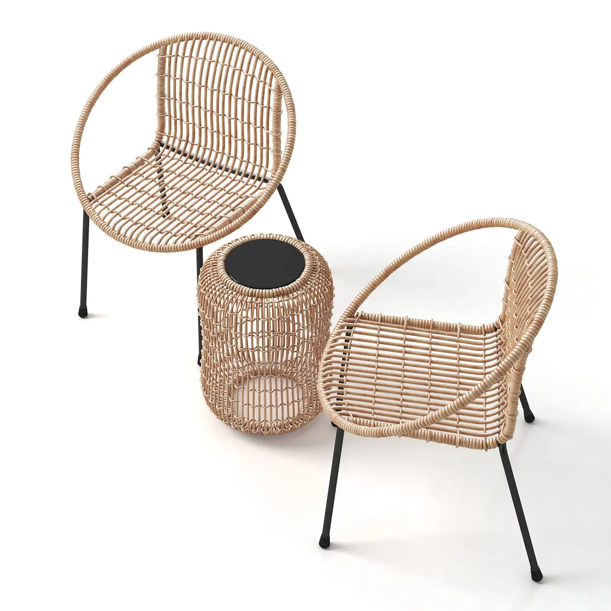 Model of small rattan table with two chairs.